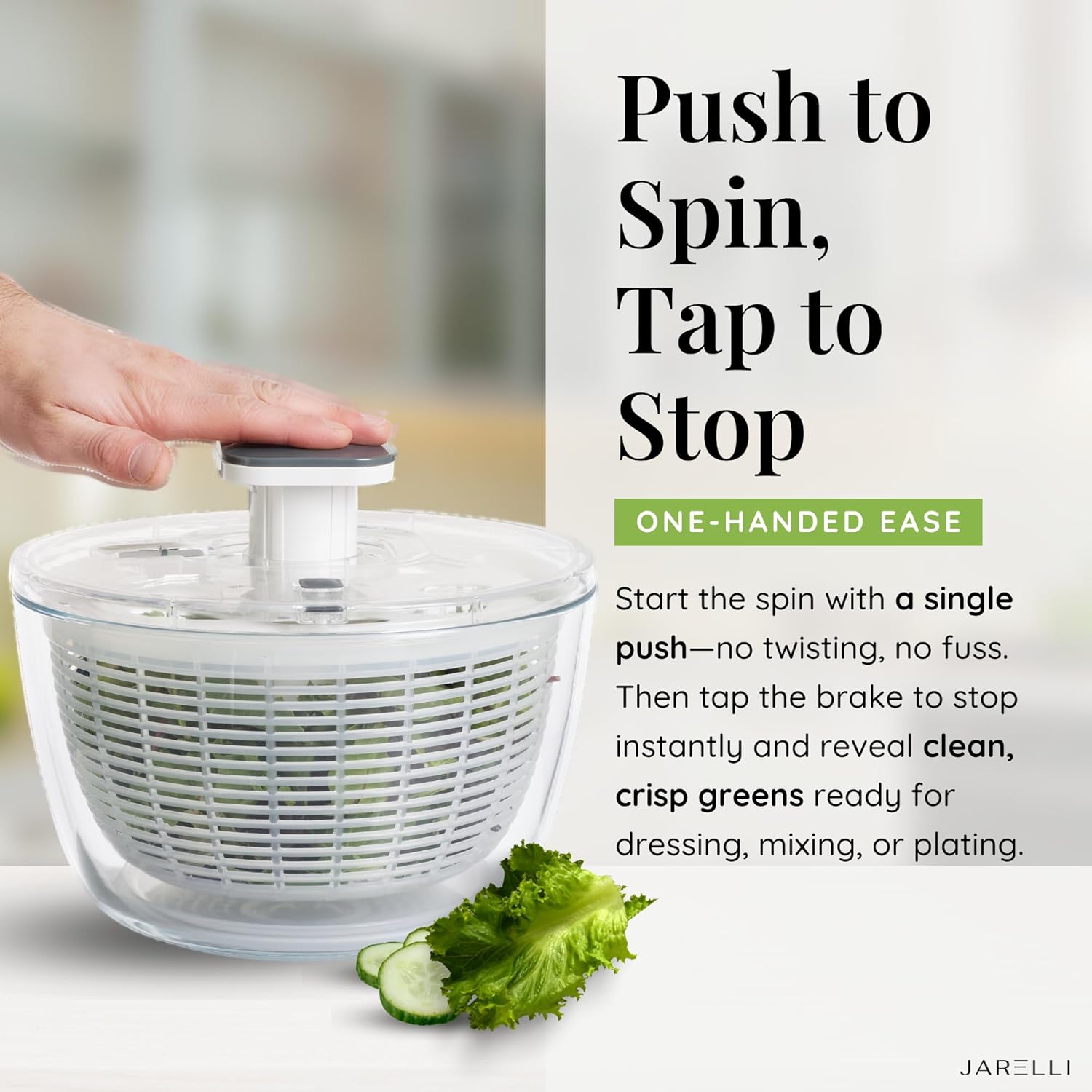- ELEGANT AND DURABLE! The Jarelli bowl of our salad lettuce spinner is constructed from high borosilicate glass easily resisting wear and tear. The food basket, lid, handle, and base are all made from food-grade plastic material and are BPA-free. Enjoy fresh salads with the assurance that your health is a top priority.