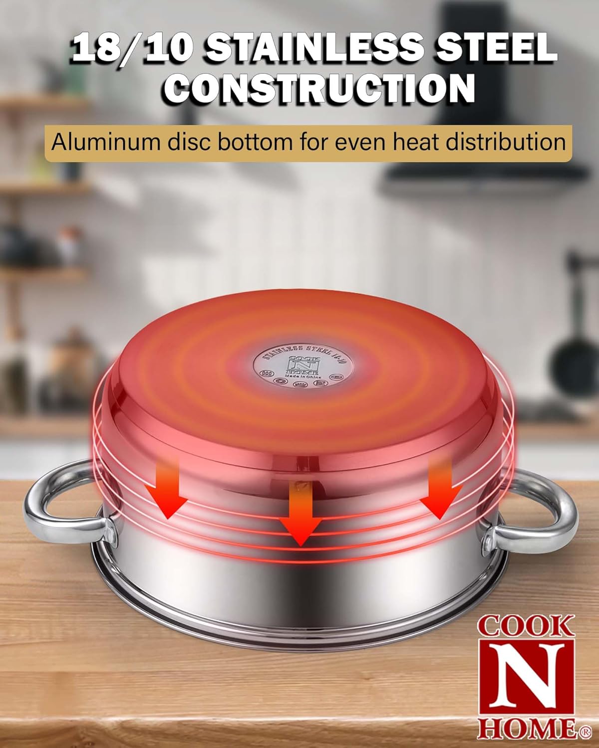 - 18/10 Stainless Steel: The Cook N Home Stainless Steel Stock Pot is made of mirror-polished 18/10 stainless steel, making it resistant to deformation; An aluminum disc bottom between the steel layers ensures even heating for optimal cooking results
