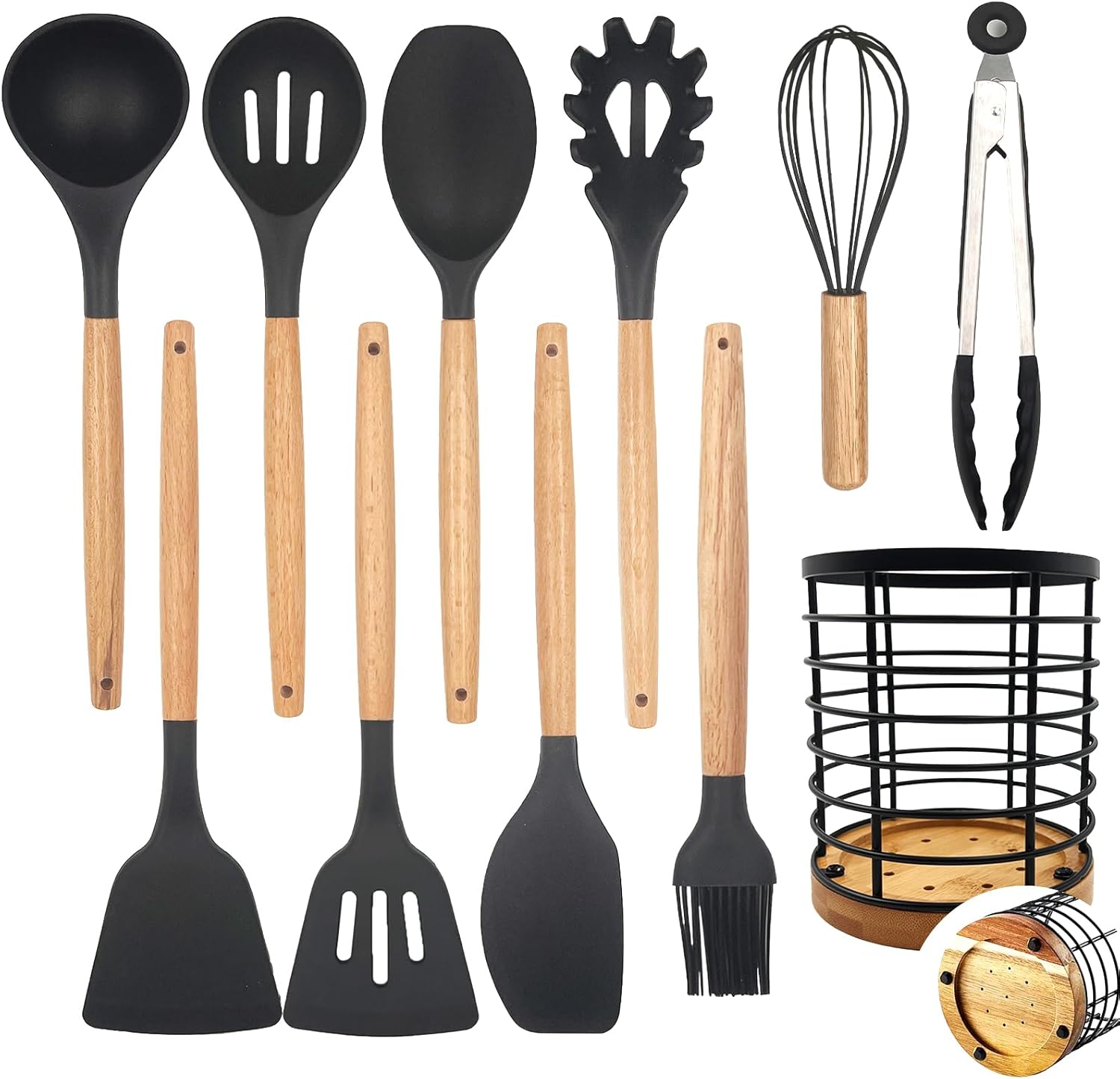 Daily Treasures 12PCS Kitchen Utensils Set,Cooking Utensils Set with Storage Holder,Kitchen Tools Made of Heat Resistant Food Grade Silicone and Wooden Handles for Nonstick Cookware