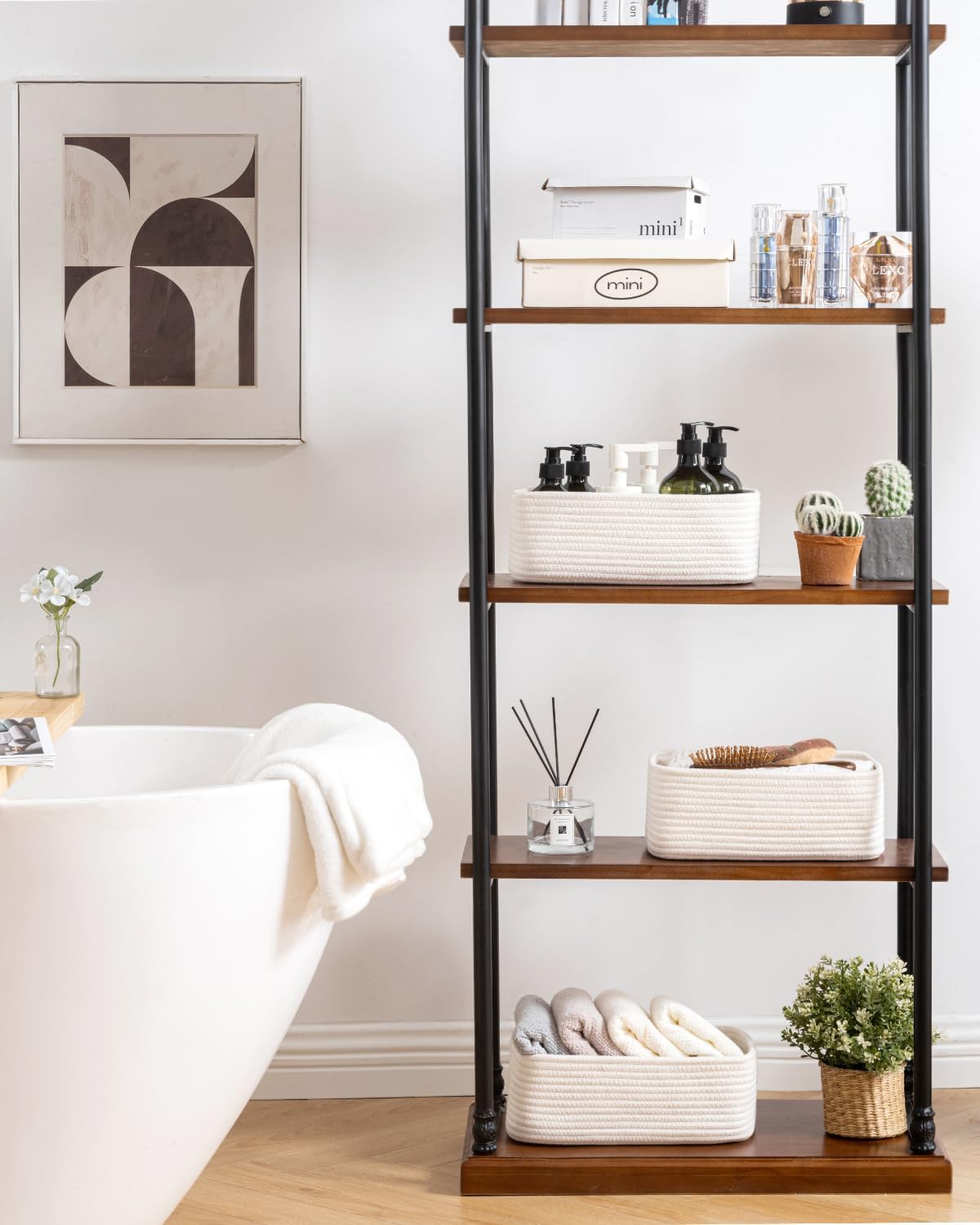 - [ Elegantly Designed to Match Any Décor ] Our small rope basket creates a minimalist appearance, and it adds a touch of warmth and texture to any room. The classic solid color design ensures seamless integration with your existing aesthetics, complementing any decoration. Perfect as decorative storage baskets for shelves, cabinets, and any open display space, making them a stylish and practical addition to any decor, enhancing the overall aesthetics of your room