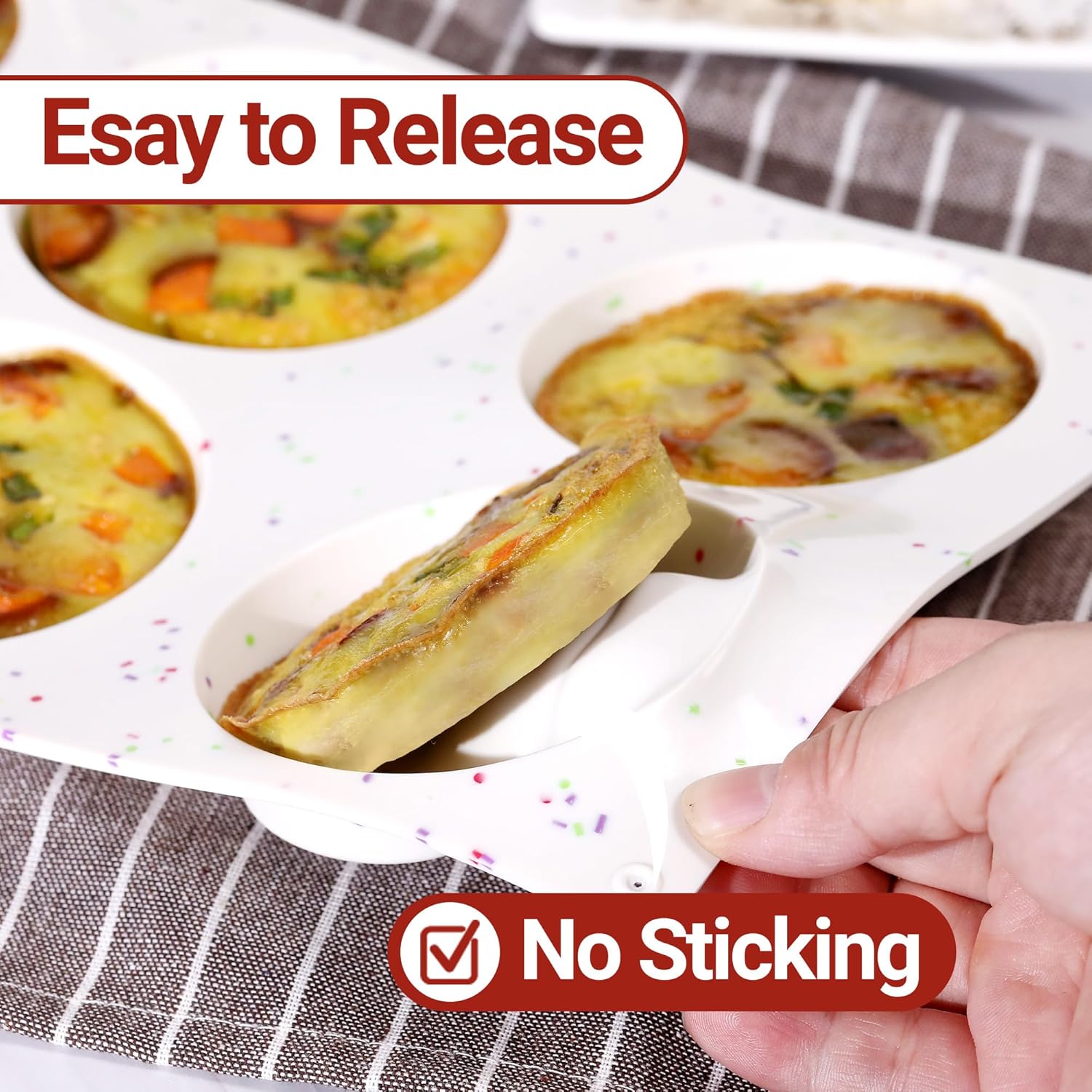 - No Stick: This round egg mold offers easy release of baked goods without sticking. A simple press from the bottom releases eggs smoothly. Silicone muffin top pan flexible design facilitates thorough cleaning