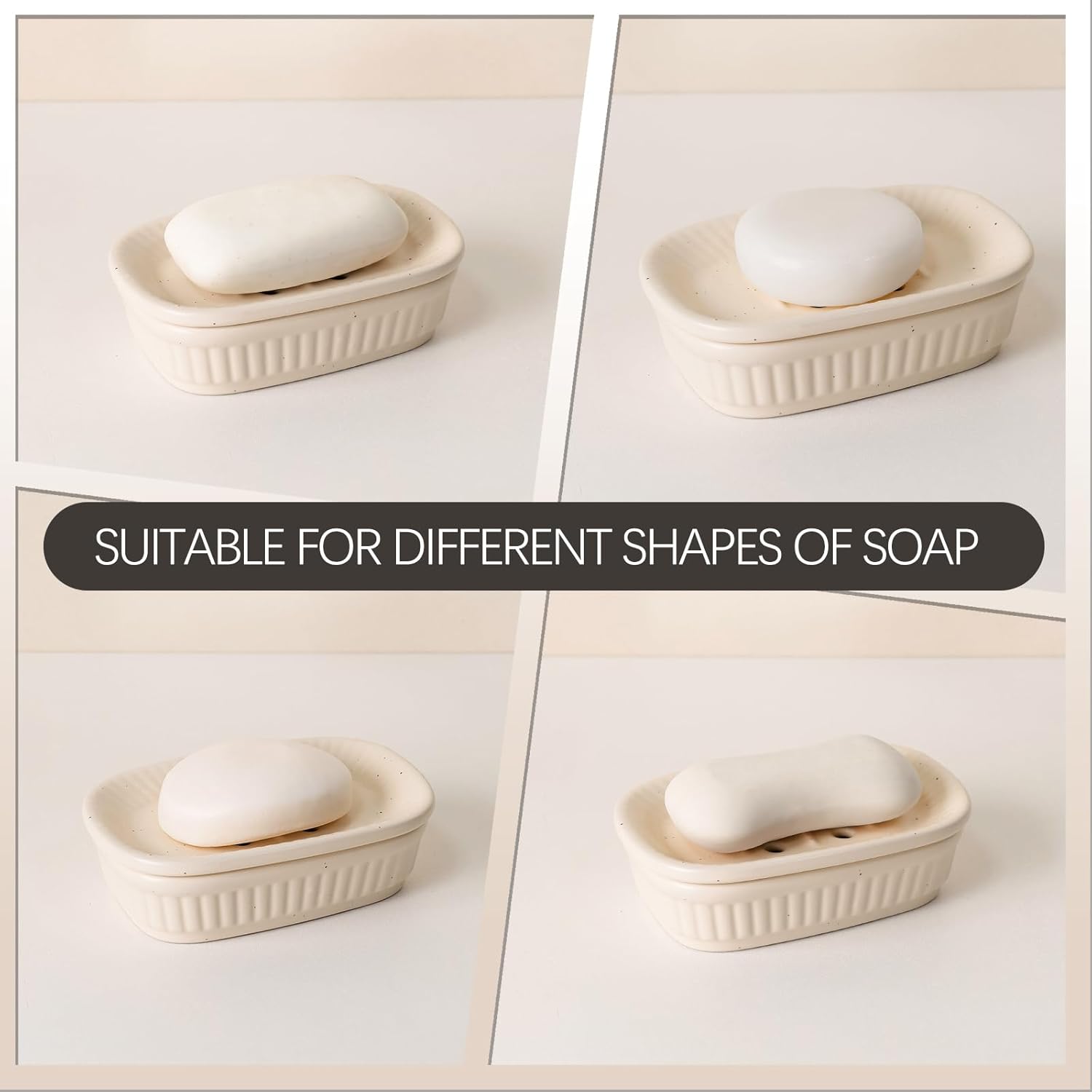- Dual-Layer Design: The ceramic soap dish upper layer has holes that allow the soap to drain the excess water that remains on it after being used; The soap holder bottom layer collects it, ensuring your countertops remain dry and clean