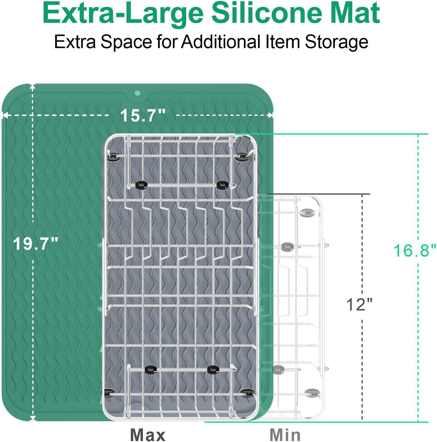 - Silicone Sink Drying Mat: Includes a food-grade large silicone sink mat measures 19.7" × 15.7". With heat resistance up to 428°F, it safely holds hot cookware to protect both your sink and countertop from scratches and heat damage. The mat's raised wavy lines promote air folw, allowing inverted utensils to dry faster. Thoughtful raised edges of mat prevent water spills and keep your workspace dry and tidy.