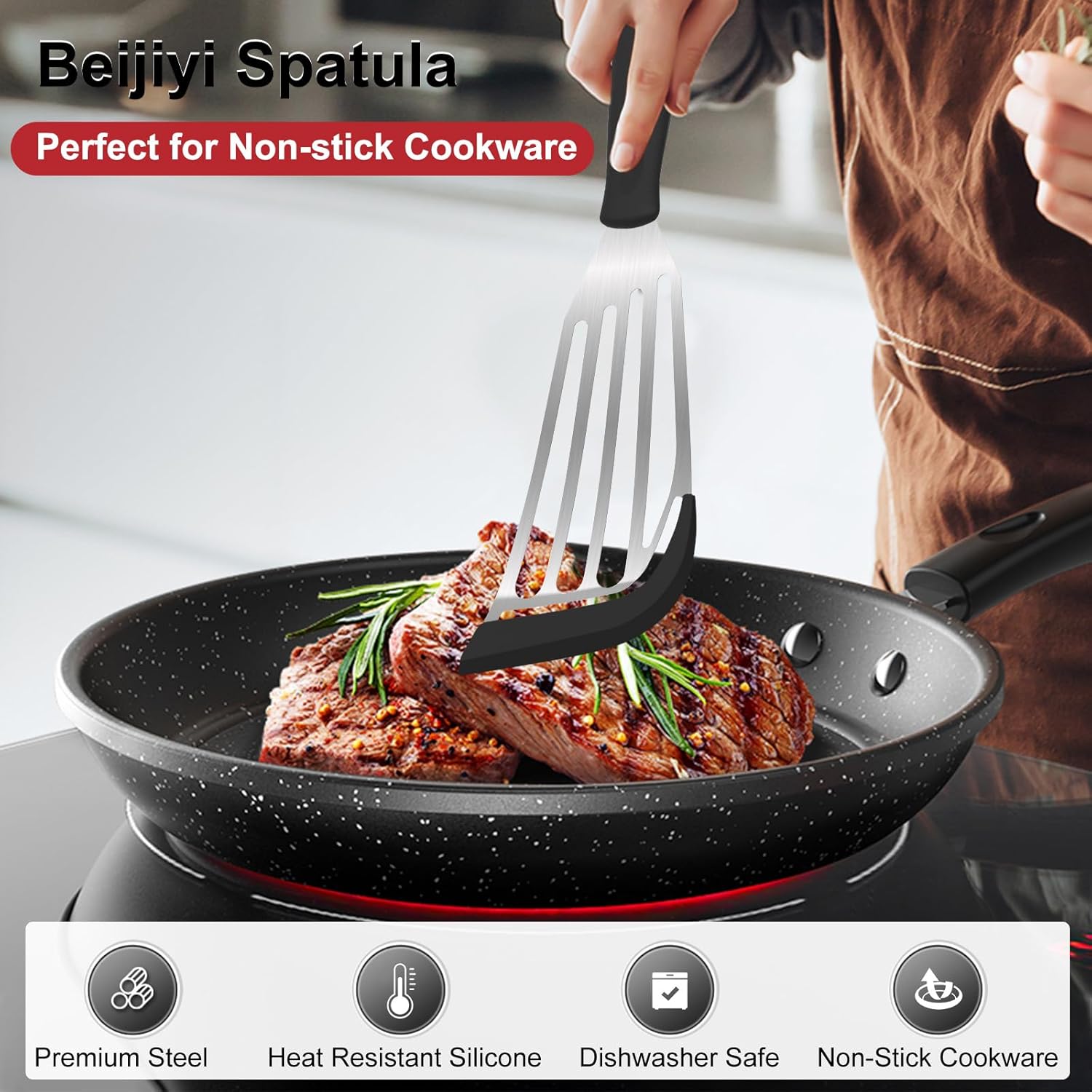 Beijiyi 2-Piece Fish Spatulas Silicone Heat Resistant, Kitchen Spatula Set for Non Stick Frying Pan, Slotted Flexible Fish Turner Cooking Utensils, Large 12.3 In, Small 10.6 In, Black Silicone Edge