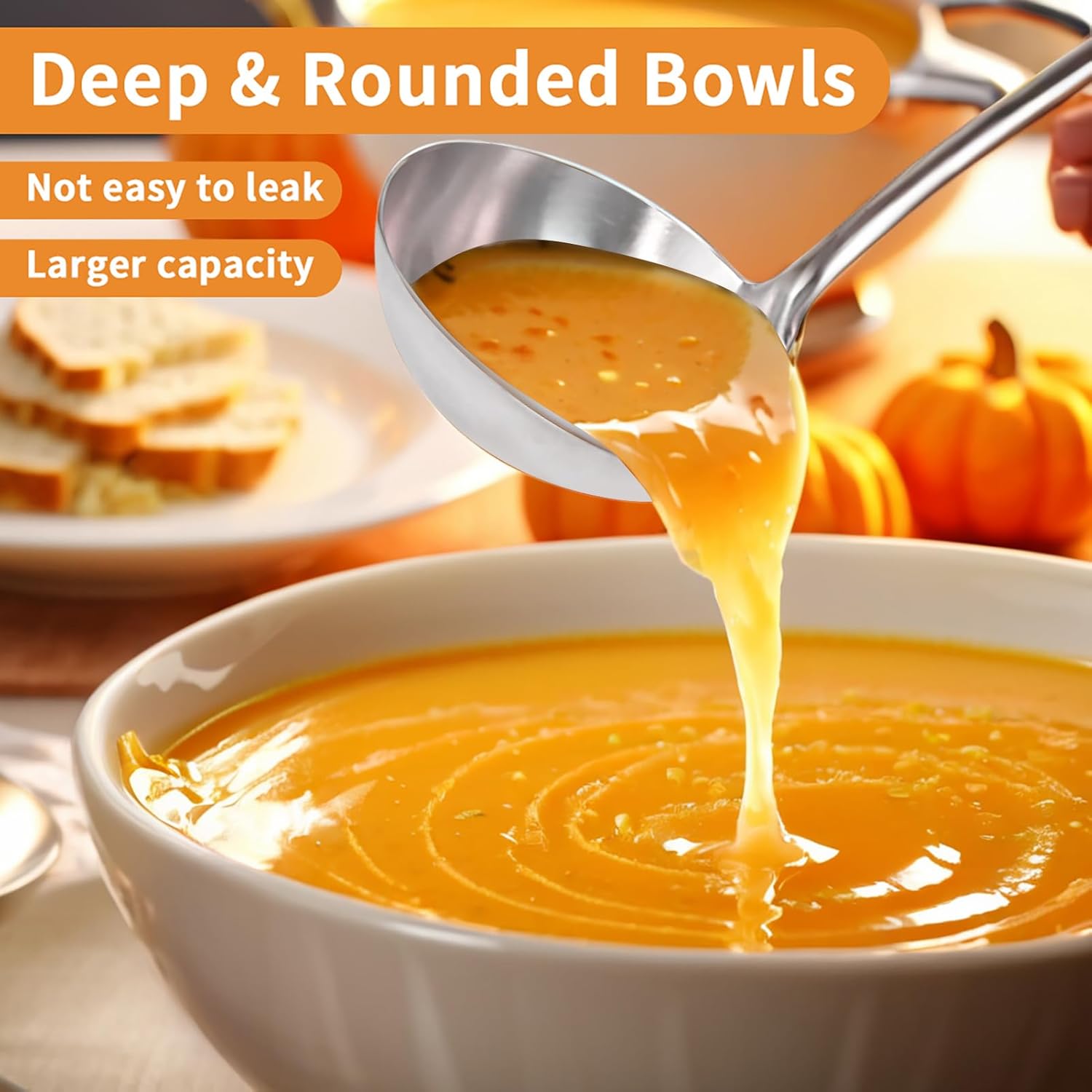 - [Functional and Versatile] This large soup ladle can be used to stir or serve delicious homemade stews, chili, spaghetti sauce, and soups or for pouring punch in a cup. The sleek construction makes it an amazing gift for your friends or family members who love to cook delicious meals. Our gravy ladle is ideal for both home and professional use.