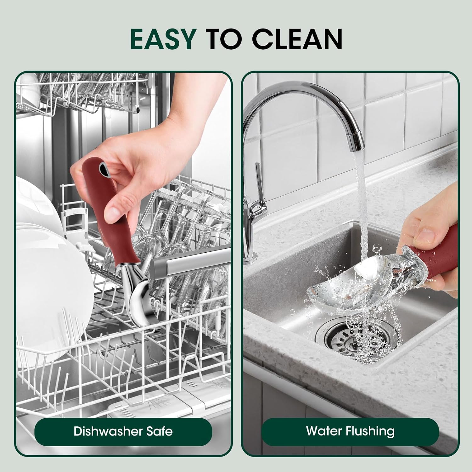 - Effort-Saving Extended Handle: Designed with a lengthened handle and an ergonomic concave arc for enhanced finger stability, this ice cream scoop ensures a stable grip while reducing wrist strain. The soft rubber-wrapped handle provides a comfortable, anti-slip hold for effortless use
