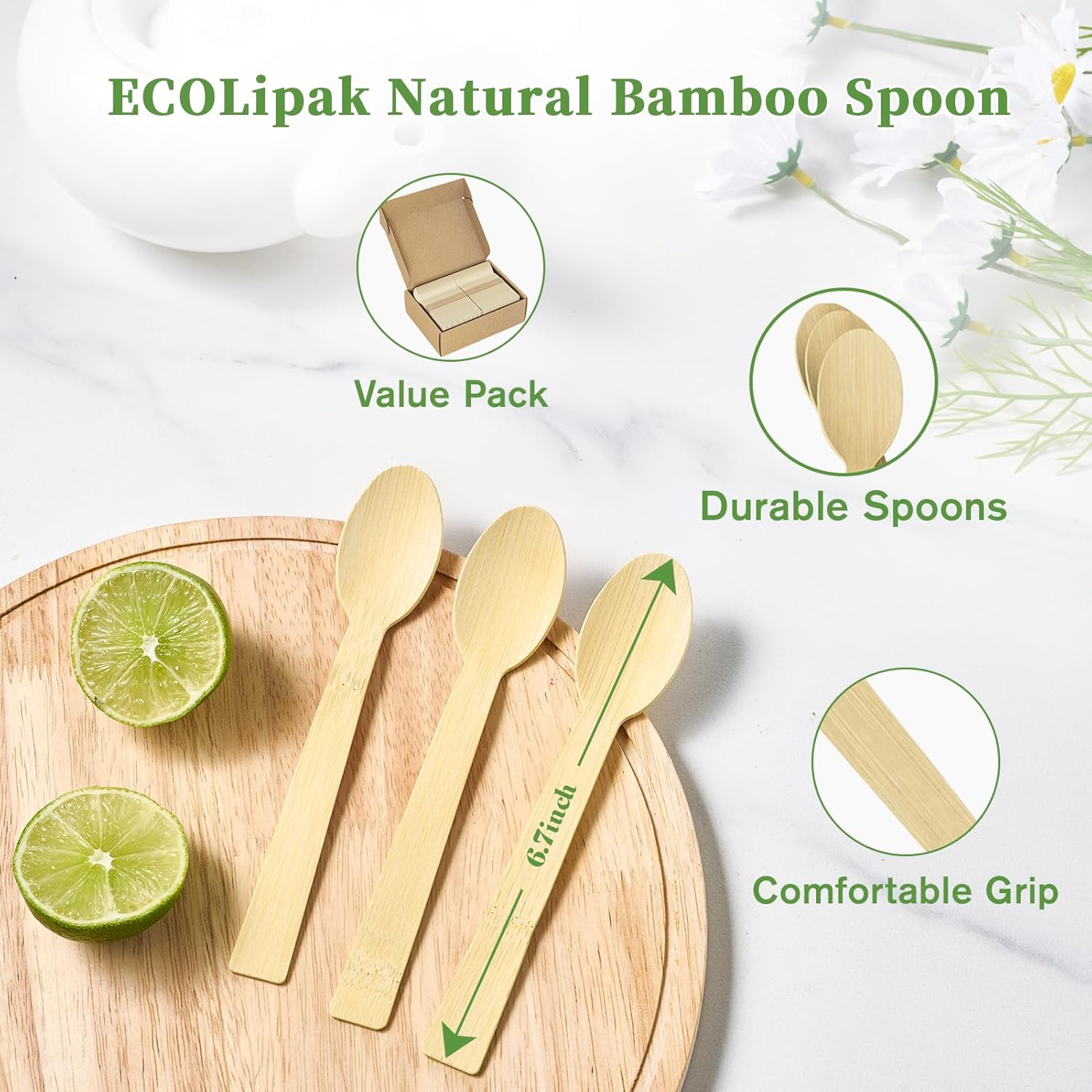 ECOLipak 300 Count Bamboo Spoons Disposable, 6.7 Inch No Splinters Heavy Duty Bamboo Disposable Compostable Spoons for Party, Wedding, Camping, Traveling, Family Dinners, Large Events