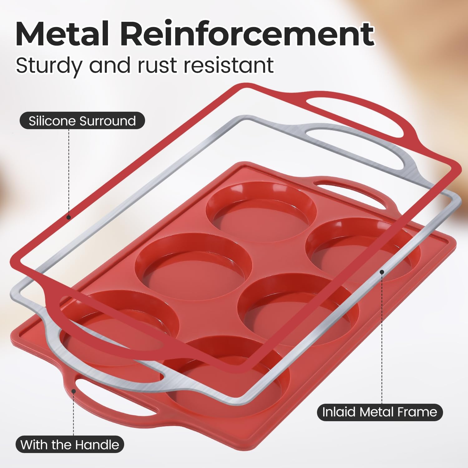 - Metal Reinforced Silicone Muffin Top Pan: The hidden stainless steel frame around the outer edge makes whoopie pie pan more sturdy