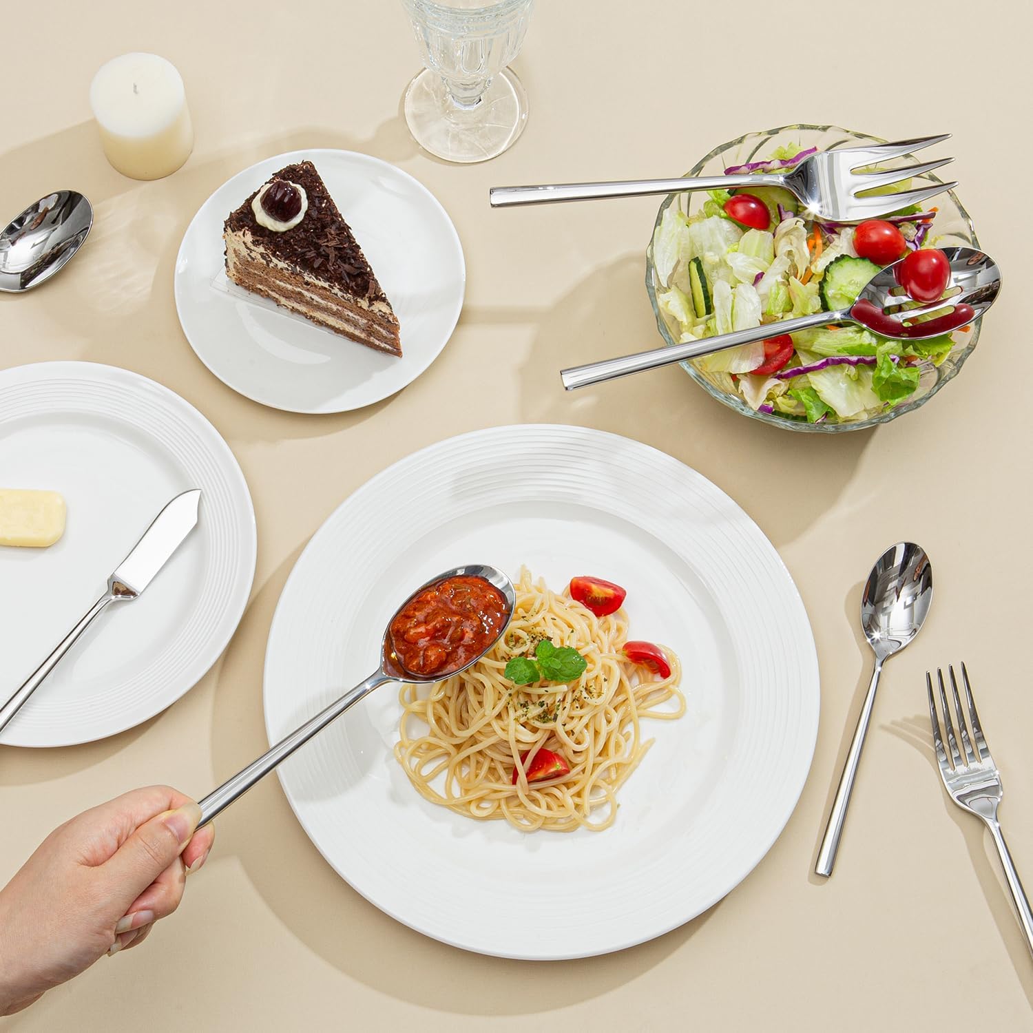 - DESIGN AND APPEARANCE: Mirror finish, natural and elegant design.Smooth and silk surface without grain, easy to clean and care in daily use. Crafted forged process,strong and durable,so that the flatware set has a thicker texture.