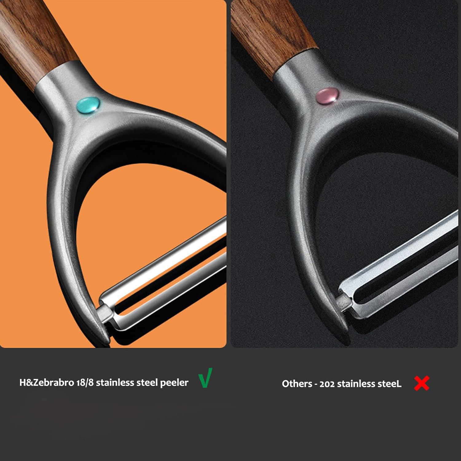 - Ergonomic Comfort - Our peelers’ design emphasizes balance and control. A thicker y-shaped metal structure paired with an extended handle ensures stability, the entire handle is made of a 4.1” metal rod with threads that passes through the wooden handle and is connected to a metal washer with threads at the bottom, while the wooden grip offers superior comfort for prolonged use. Enjoy ultimate precision and confidence with every peel