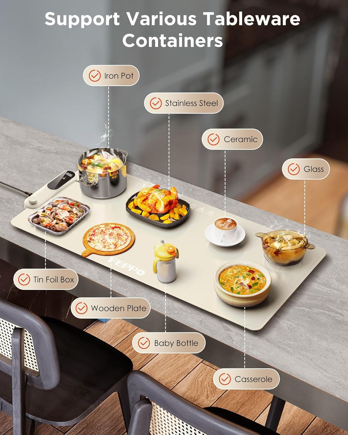 - 【Extended Size for Convenient Sharing】FEPPO food warming mat, XXL size 35"x16", can heat up more dishes to make it convenient for you to prepare meals efficiently, and also can meet the needs of large families, parties, which makes it convenient for more people to share the food, enhancing the dining experience. Perfect for buffets, parties and gatherings