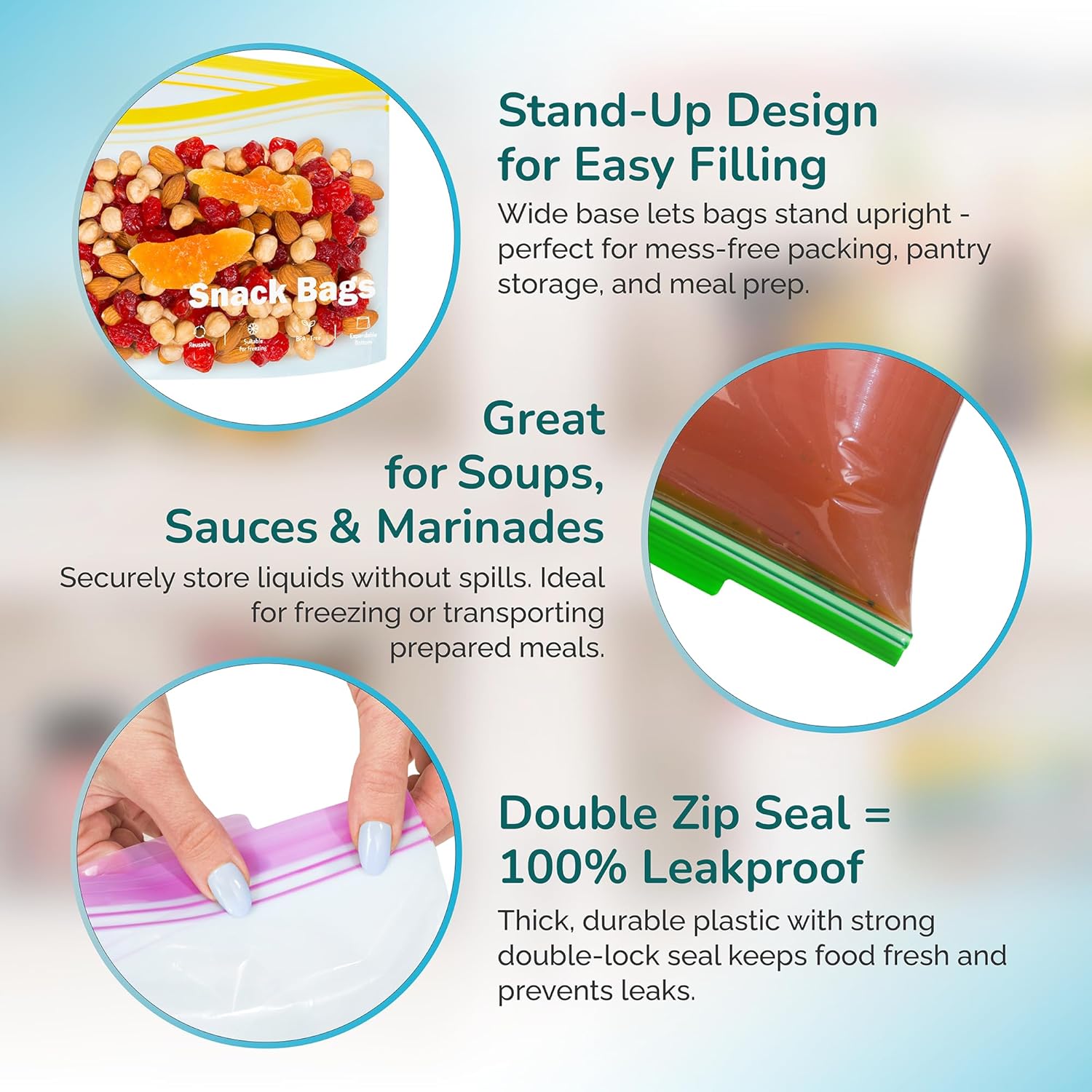 - 🔹 Stand Tall & Seal Tight — No Leaks, No Mess. Each bag stands upright with a wide, expandable base — making filling and storing easier than ever. Dual zipper locks snap shut to keep food fresh and liquids secure
