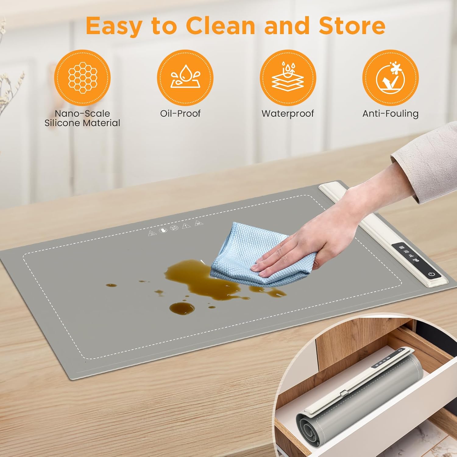 - Premium Silicone Nano Material: Our electric warming tray is made of top-grade flexible silicone nano material. It is splash-proof, stain-proof and oil-proof. The innovative foldable design solves the common bulky and inconvenient storage problems of traditional heating trays, and can be easily and compactly stored without wrinkling, ensuring long-lasting quality.