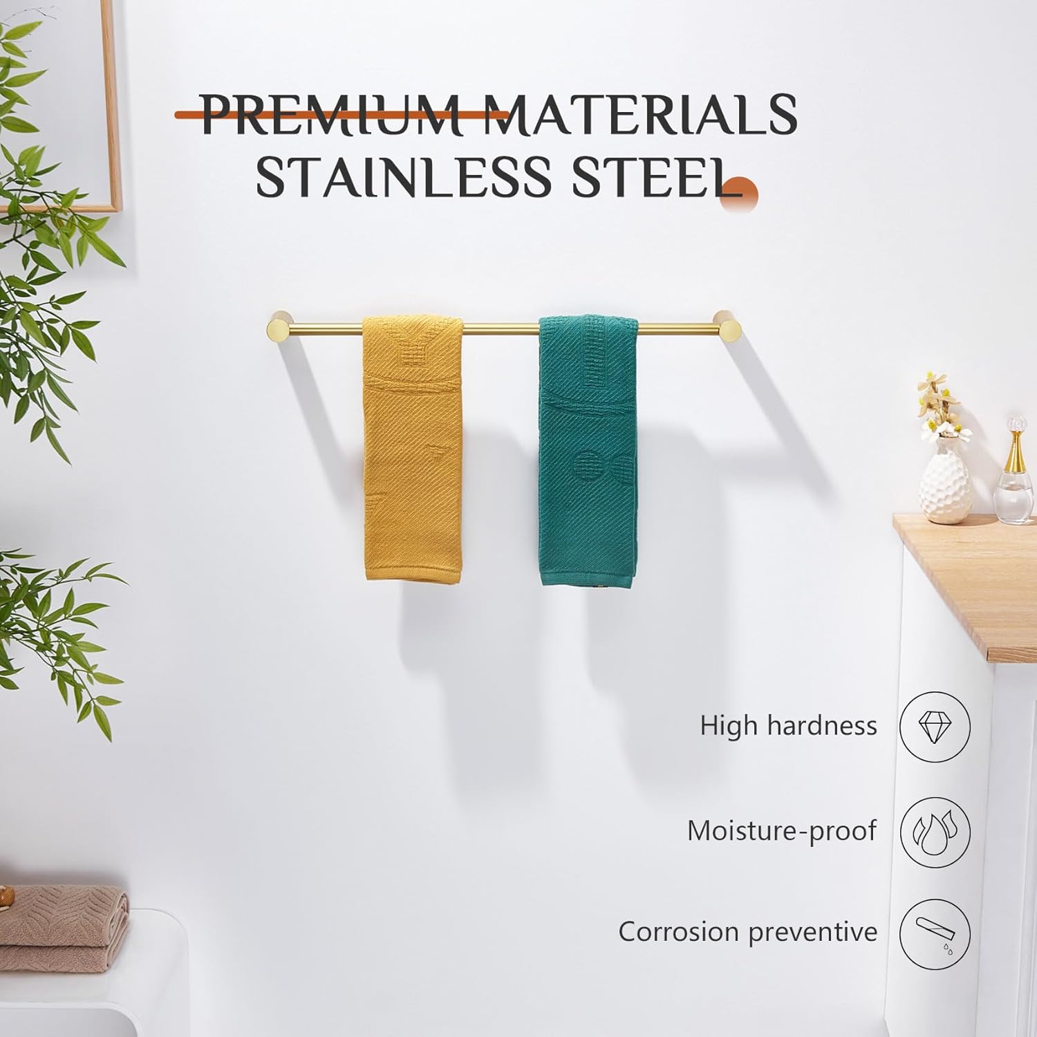 - ◄ BRUSHED GOLD ► The bathroom towel holder is brushed gold finish which is fingerprint-proof and water-proof. And the surface covering is resisting daily scratches, corrosion, and tarnishing