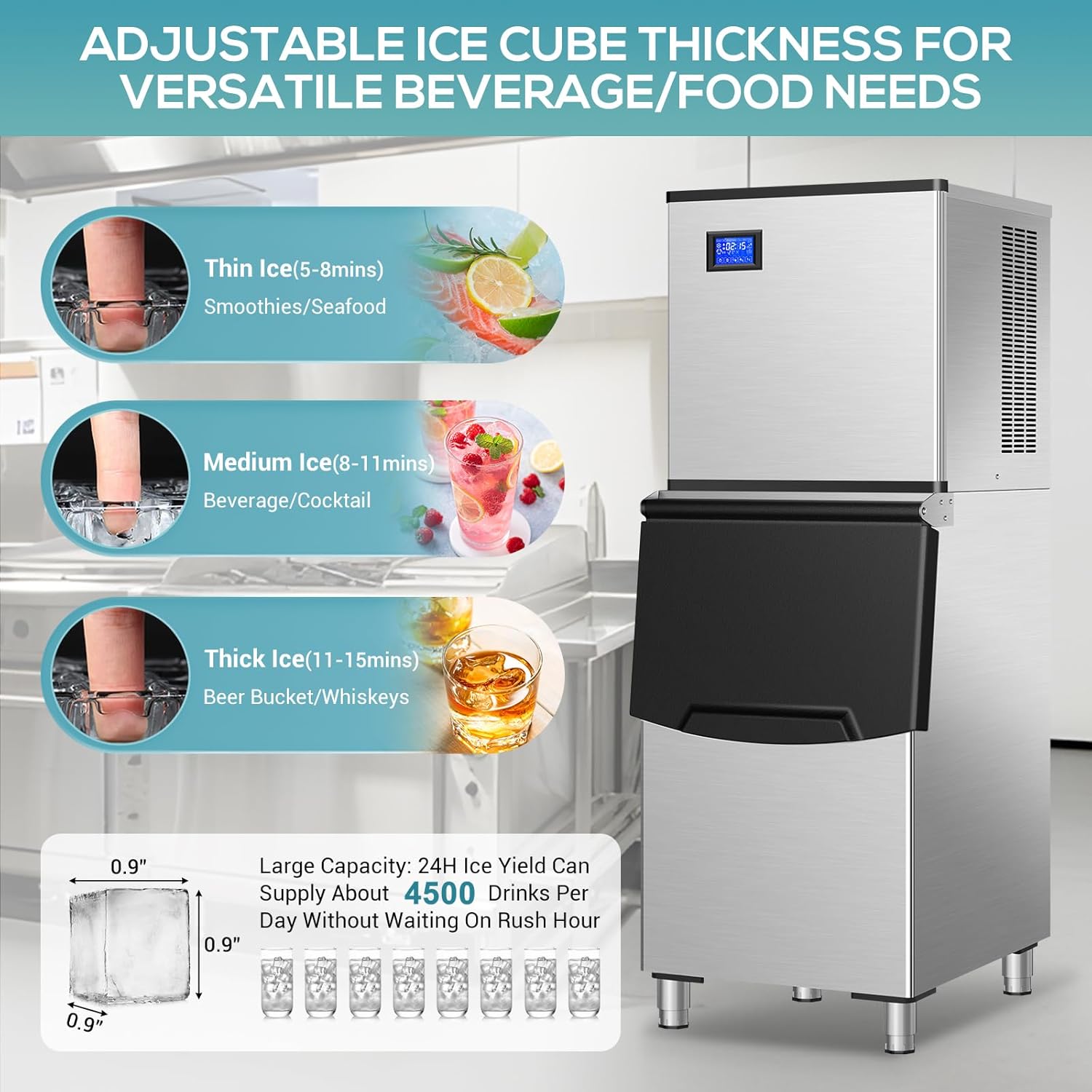 Commercial Ice Maker Machine 430Lbs/24H, Industrial Ice Machine 350 Lbs Storage Bin, 156PCS Clear Ice Cubes in 11 Mins, Freestanding Stainless Steel Ice Maker for Restaurants/Bar/Large Families