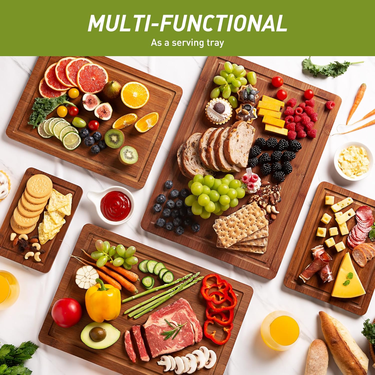 - Perfectly Sized for Versatile Use: Our bamboo cutting board set has five sizes – 9"x6", 11"x8.5", 14.5"x11", 17.5"x12" and 19.5"x14" . This set of 5 bamboo cutting boards are perfect for everyday food preparation, from slicing fruit to chopping veggies. Thoughtfully sized to fit different needs without taking up too much counter space. Whether dicing veggies, slicing fruits, or carving meats, there's a chopping board for every occasion. Perfect for various kitchen tasks and charcuterie boards.