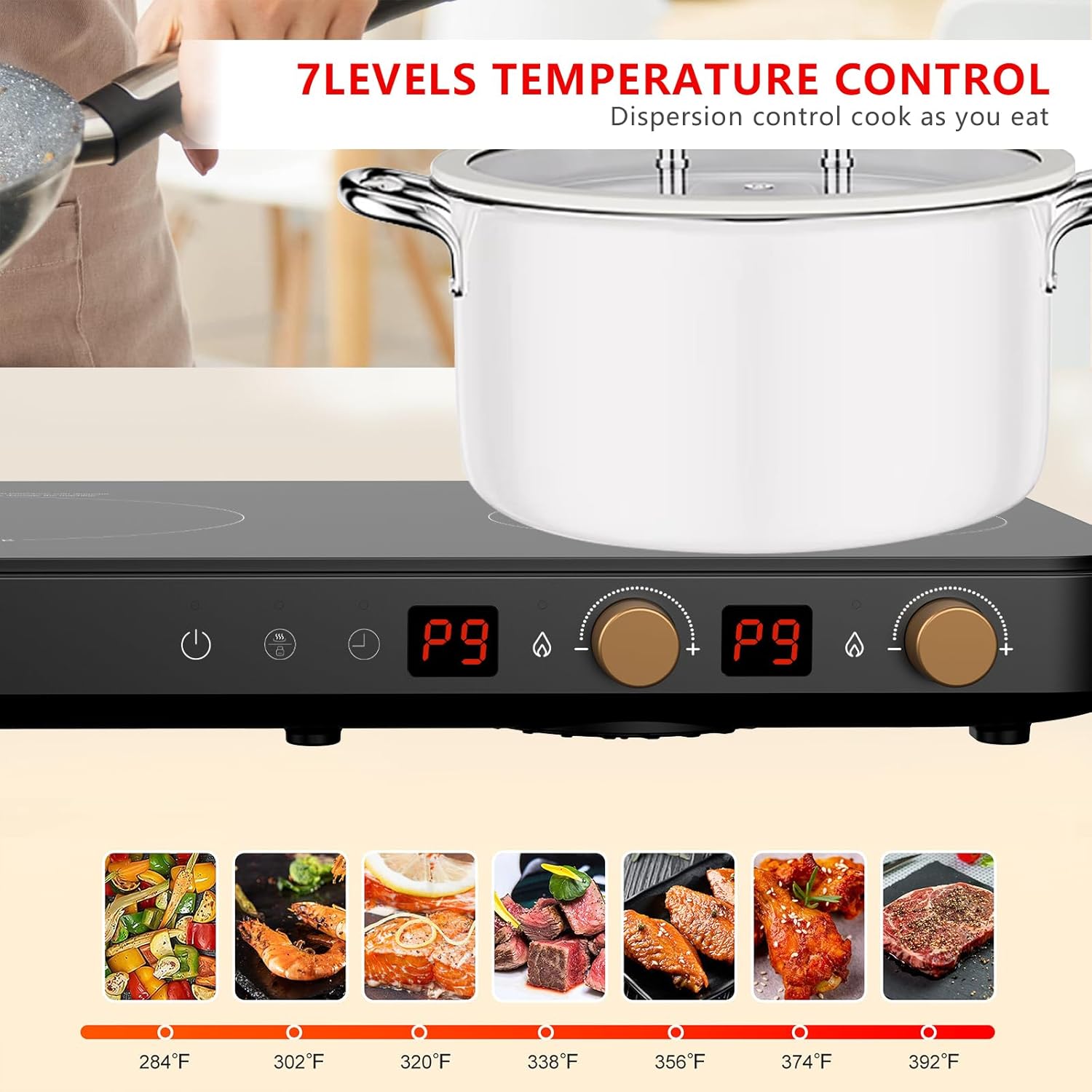 - Dual stove independent temperature control, precise cooking: The induction cooker is equipped with two powerful 1200W stoves, with independent controls on the left and right sides. It provides 8 adjustable power settings, not only can different temperatures be set on both sides to accurately meet the cooking requirements of different ingredients (the frying function has the same temperature), but also can cook multiple dishes at the same time, greatly shortening the cooking time.