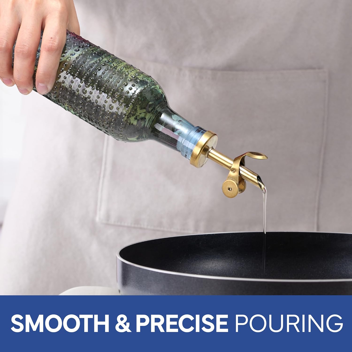 • Beautiful and Functional - Our colored glass oil dispensing bottles, with elegeant colors, gold tops and gold wire rack, will elevate your kitchen. Don't use just any oil bottle, upgrade the way you cook. That's our mission.