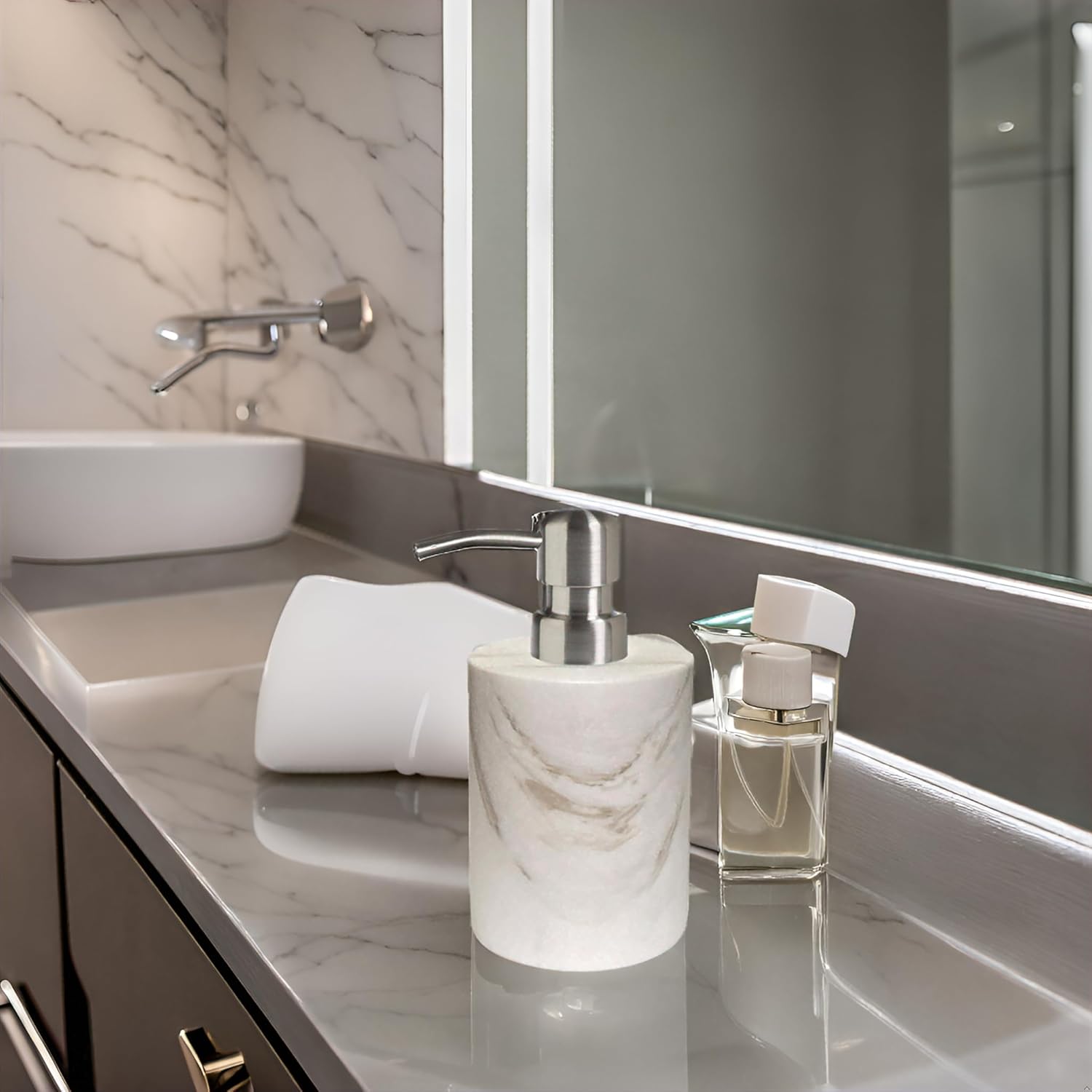 Marble Soap Dispenser, soap and Lotion Dispenser Bathroom, with Rust Proof Stainless Steel Pump Refillable for Kitchen Bathroom Countertop-Hand Lotion and Liquid Soap Dispenser-White
