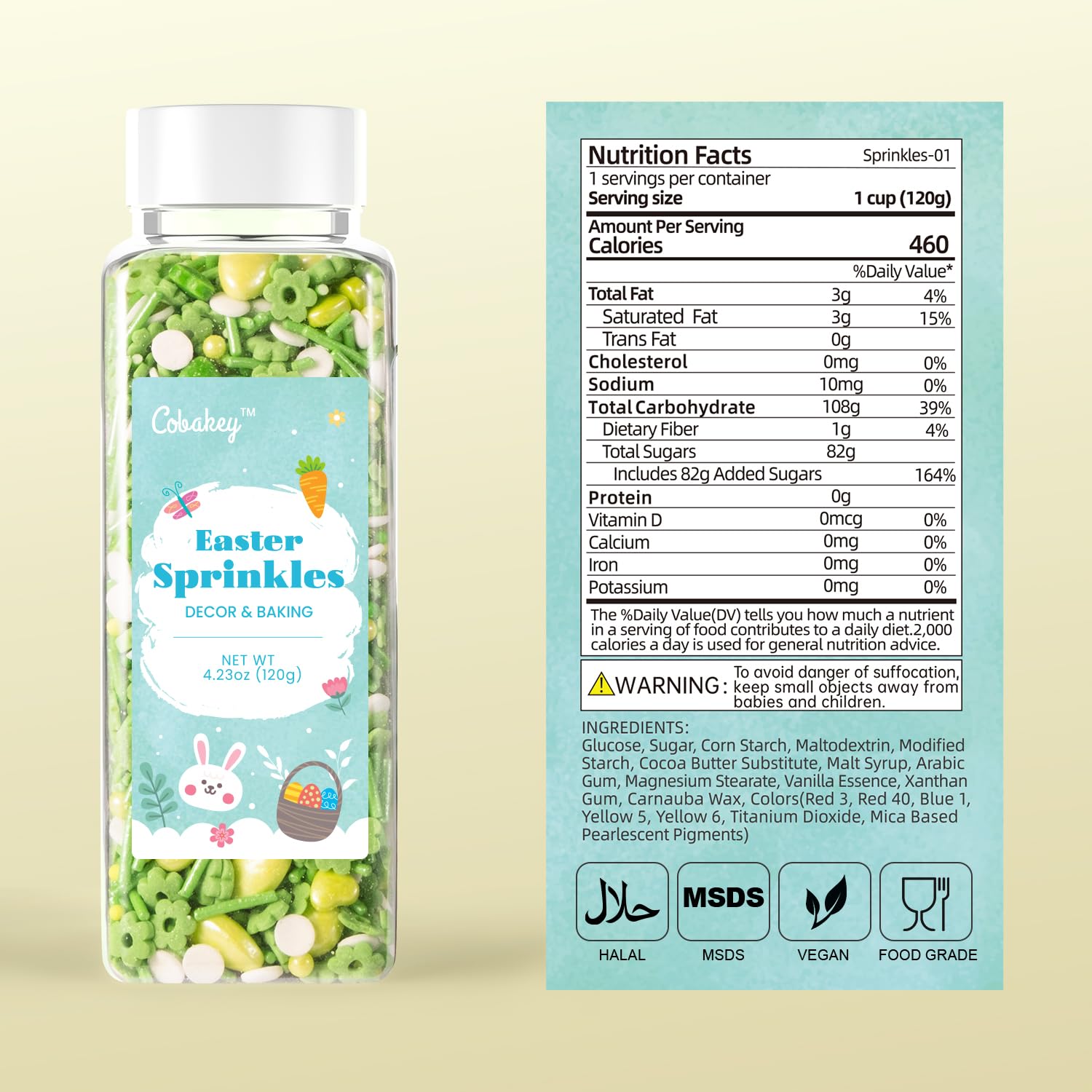 - Easter Sprinkles for Cookies: Each bottle weighs 4.23oz, 120g. Our Egg Sprinkles are made from safe ingredients. Our Spring Sprinkles are in different colour of Yellow & Green Edible Candy.