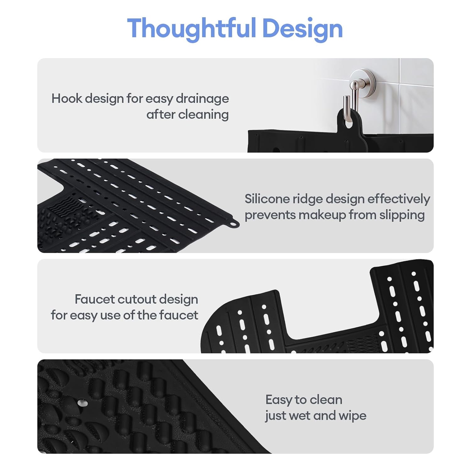 - Easy to clean and easy to use: Our bathroom sink mat has 3 different texture designs on the brush washing area, which effectively helps you remove makeup residue with different brushes, clean without hurting the bristles, and wash and dry in one. It is easy to wipe clean and towel dry after use to prevent water spots, and it dries quickly.