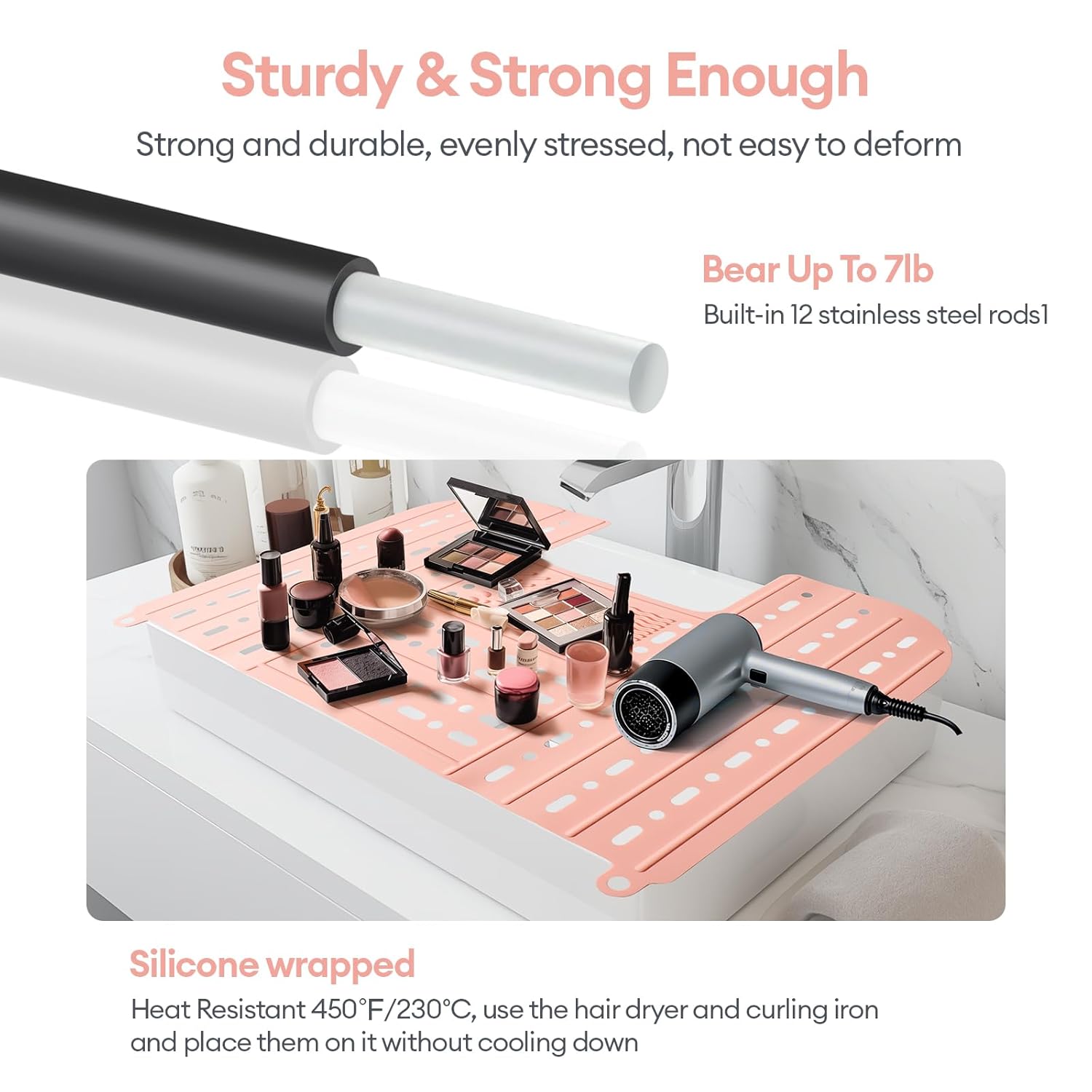 - Sturdy and durable: The sink cover for counter space is made of soft heat-resistant silicone and can withstand temperatures up to 480°F. There is no need to worry about hair dryers, curling irons, and other heating tools scalding the desktop; there is a steel rod running through the silicone, which is high temperature resistant and has a high load-bearing capacity. It is not easy to collapse and can bear up to 7 pounds.