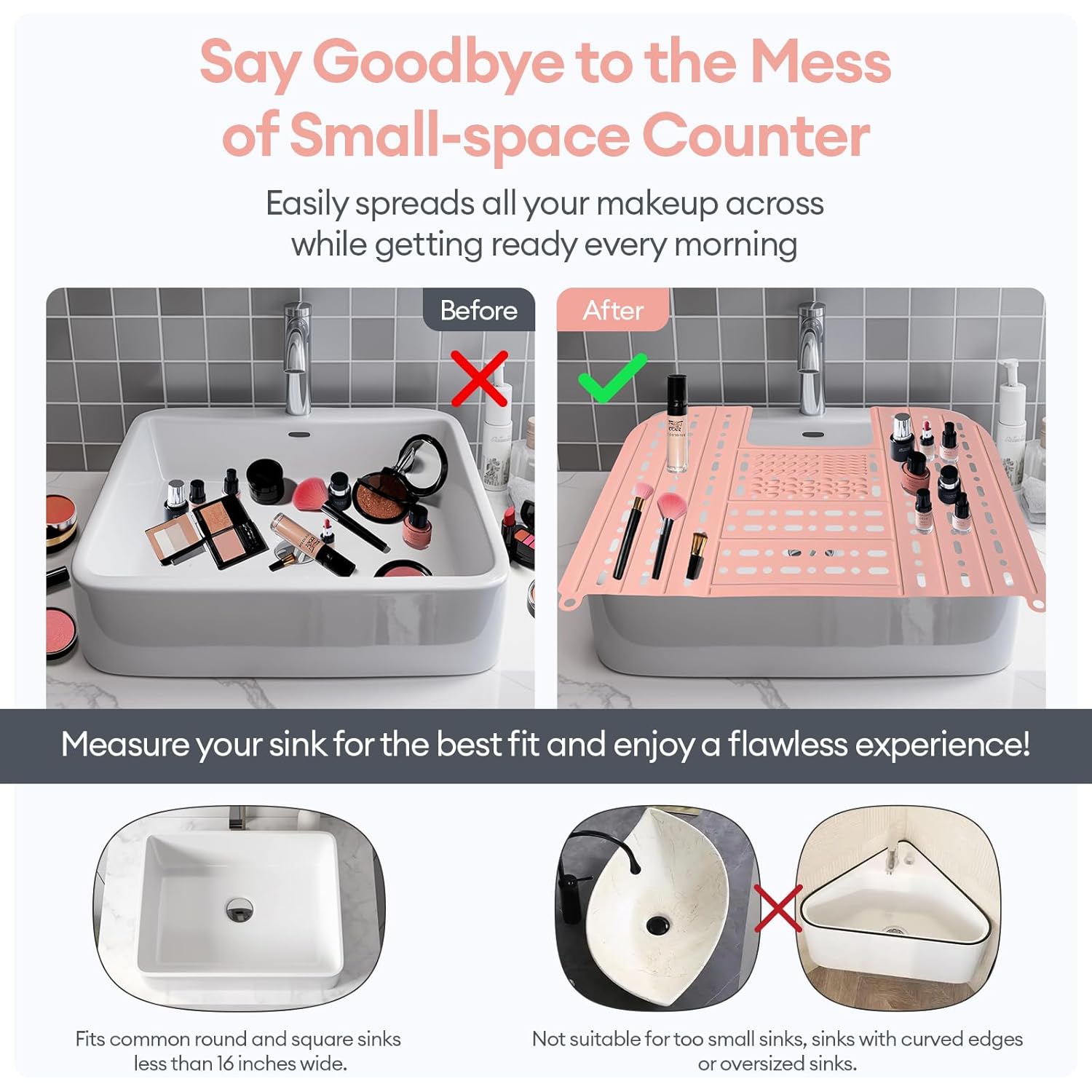 - Maximize bathroom sink space: This bathroom sink cover fits most sinks and can extend your countertop. It allows you to easily store makeup tools, such as curling irons, makeup brushes, makeup, skincare products, etc. and prevents brushes and other cosmetics from falling into the sink.