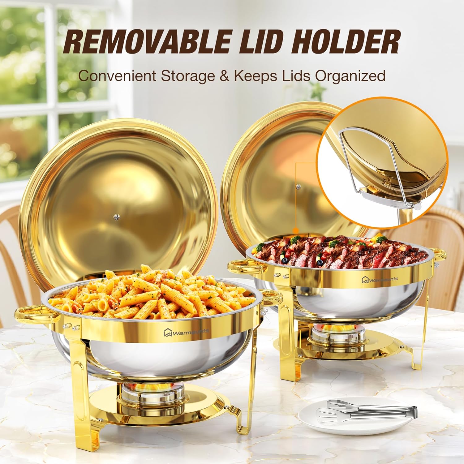 - Excellent Food Insulation: Keeps food delicious for hours! WARMOUNTS gold chafing dish buffet set with lid holder is made of premium stainless steel, with excellent food warming performance and durability. For summer events, simply add ice cubes to keep chilled dishes refreshingly crisp—great for outdoor gatherings