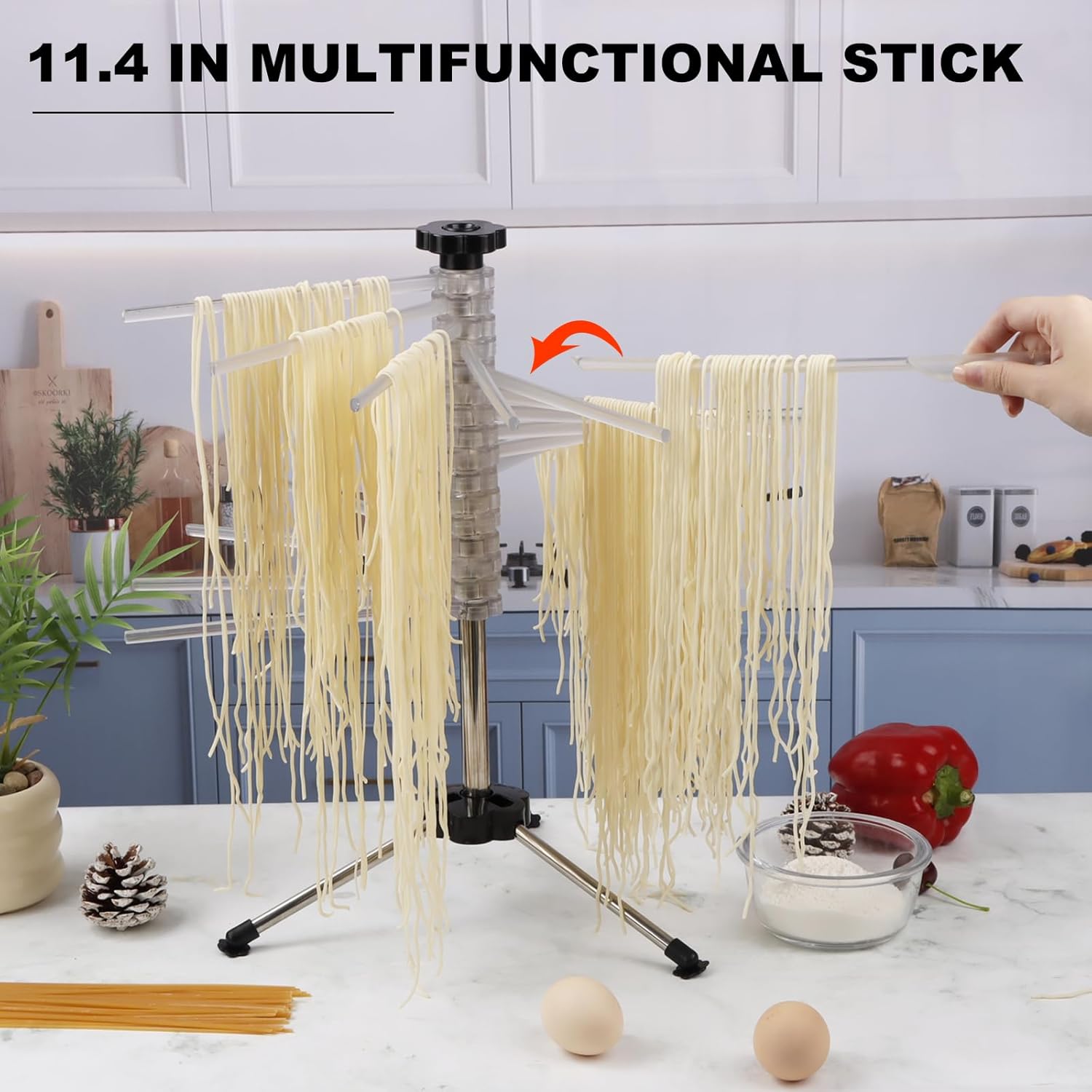 - NO INSTALLATION REQUIRED- The pasta drying rack does not require installation, just take it out of the box and unfold the bottom tripod and place it on the table. This process only takes 10 seconds! The rotary rods makes it much easier to transfer the noodles. No need to move the pasta hanger continuously. Its compact footprint offers ample space for drying all types of long noodles and homemade pastas. Easily dry all long noodles, like spaghetti and fettuccine noodles, angel hair, fettuccini, fusilli, lasagna, even lo mein noodles, and more