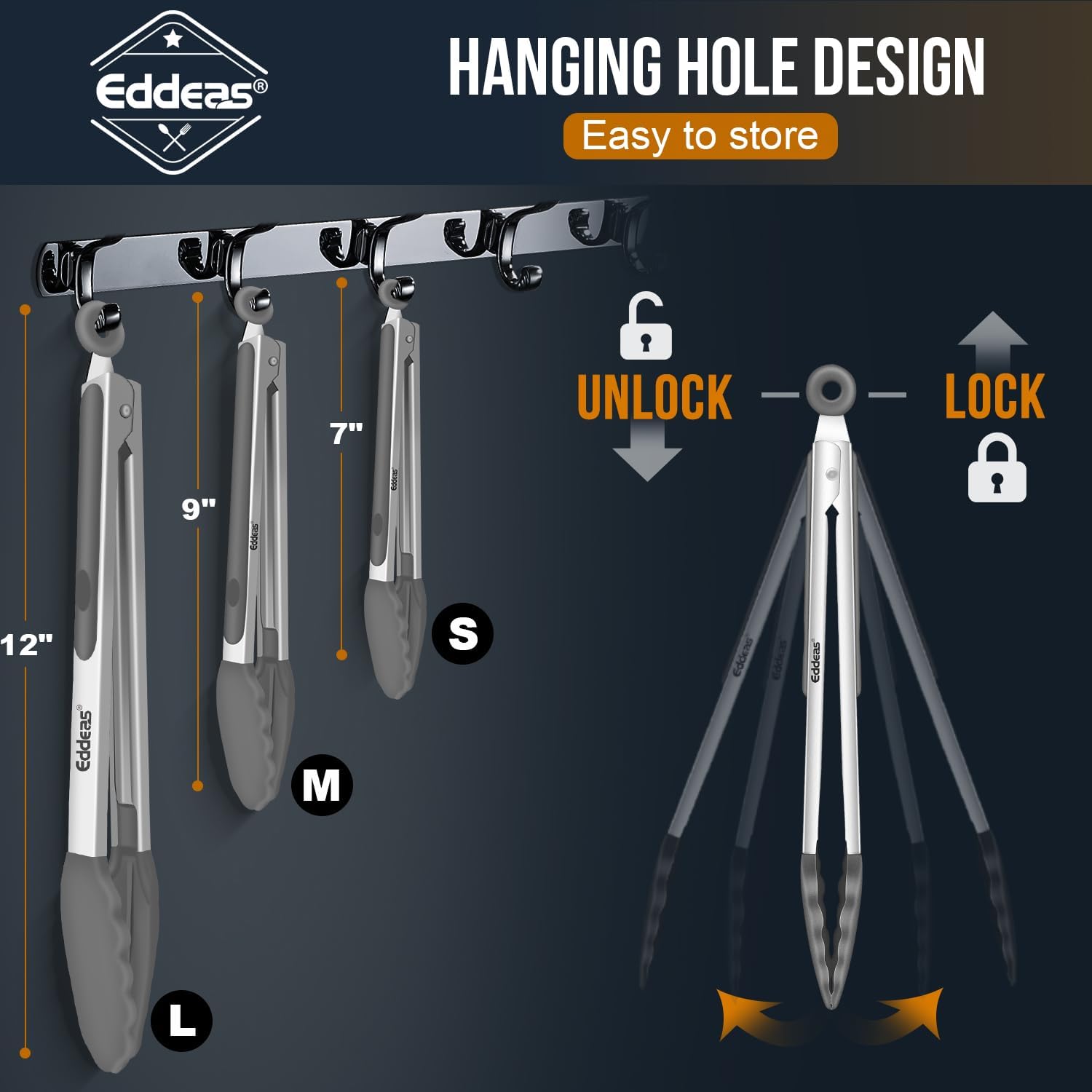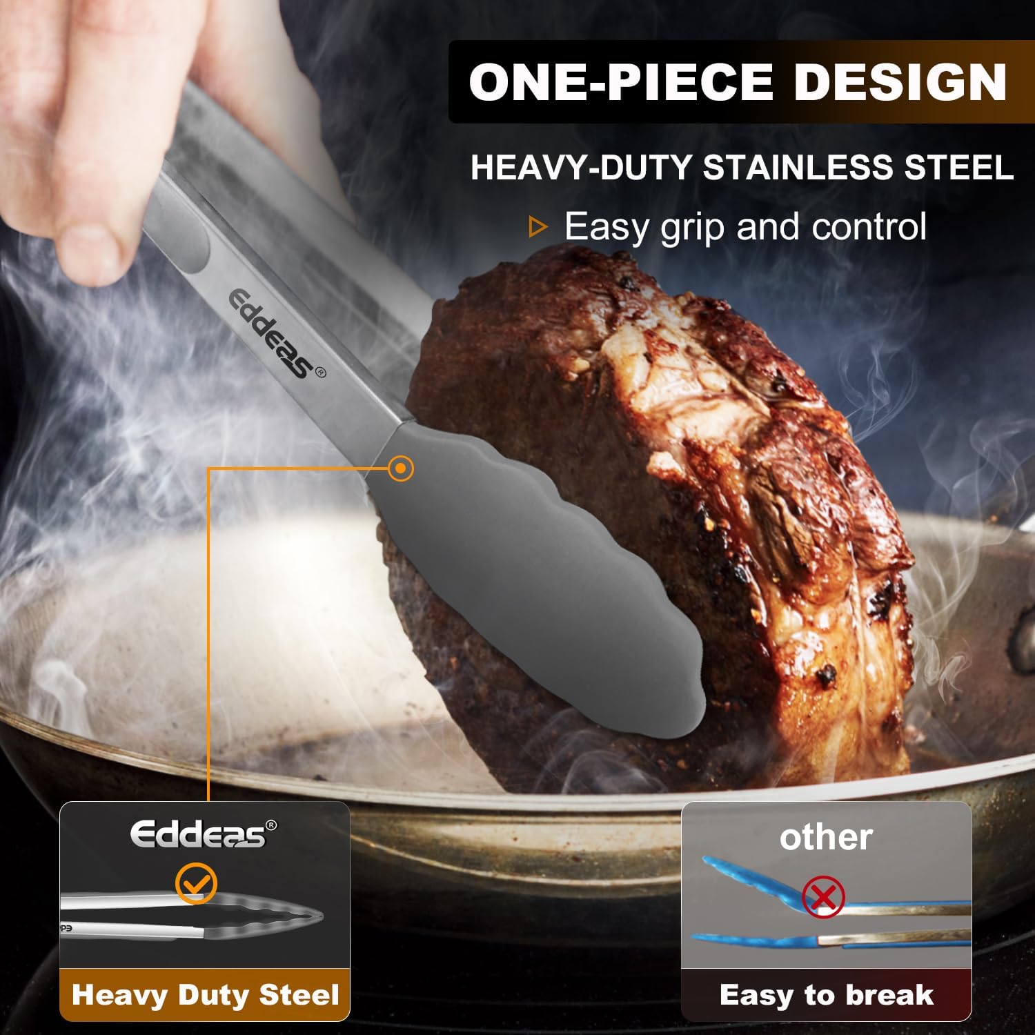- FOOD GRADE MATERIALS - Eddeas tongs for cooking featuring a food grade silicone head, the tongs are gentle on your nonstick cookware so you can worry less about scratching and wear and tear, silicone is heat resistant up to 600 degrees Fahrenheit, making it a great option for nearly any cooking task. Set of 3 - 7", 9" & 12 inch Everything you need on a daily basis