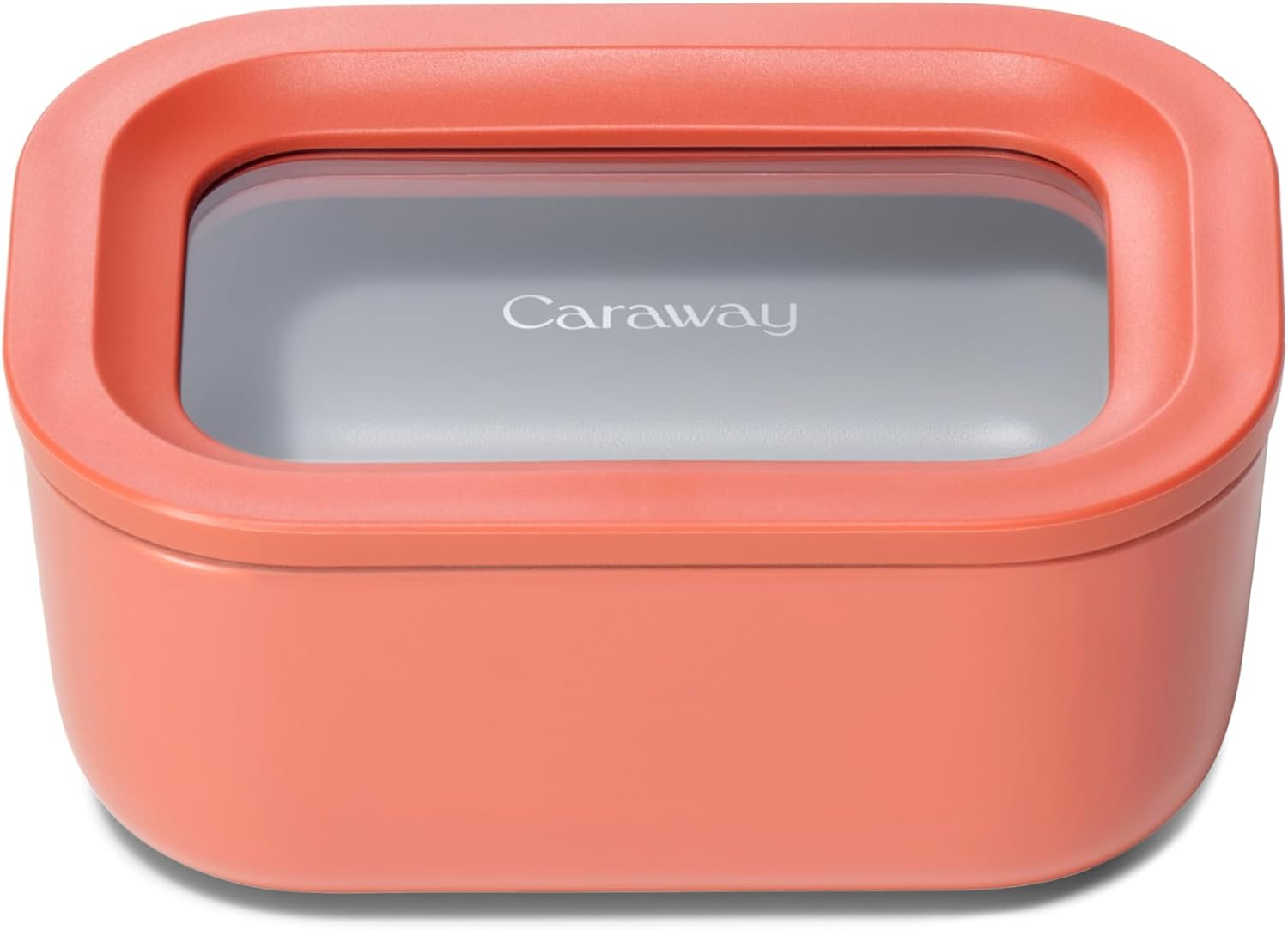Caraway Mini Rectangle Food Storage Container - 2.6 Cup Glass Storage Container for Food - Non-Toxic Ceramic-Coated Glass - Air Release Technology - Compact & Stackable Design - Perracotta