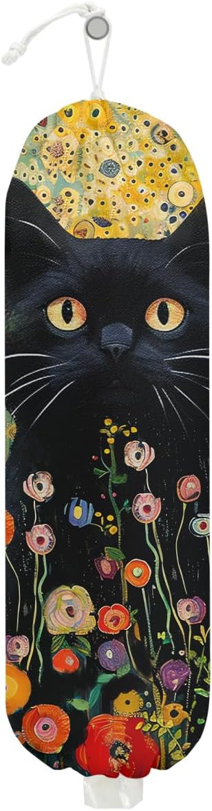 Flower Cat Plastic Bag Holder, Wall Mount Grocery Bag Holder, Plastic Storage bag, Pull Rope Free Adjustment, Plastic Bag Holders for Grocery Bags, Plastic Bag Dispenser for Home Kitchen Cabinet