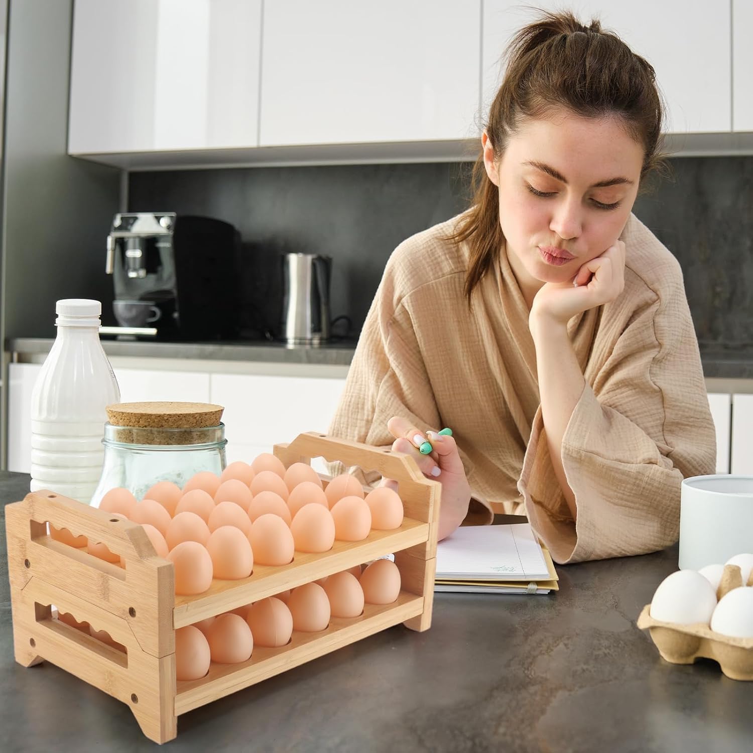 - ELEGANT BAMBOO EGG HOLDER – Made from high-quality bamboo, this egg holder offers a practical storage solution while saving valuable countertop space. Its rustic charm enhances your kitchen décor with a natural, stylish touch. Ideal as an egg basket for gathering fresh eggs, or a wooden egg holder for your fridge or countertop.