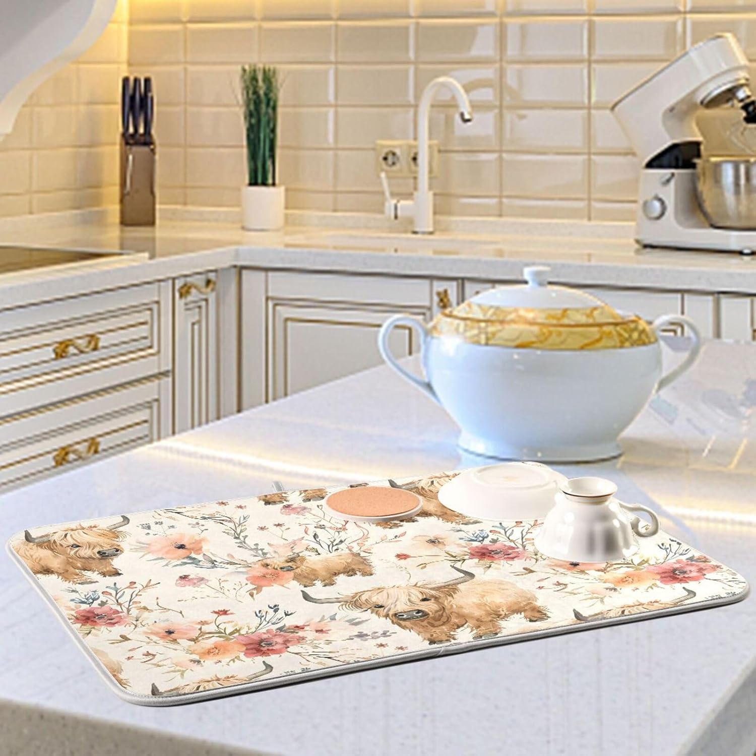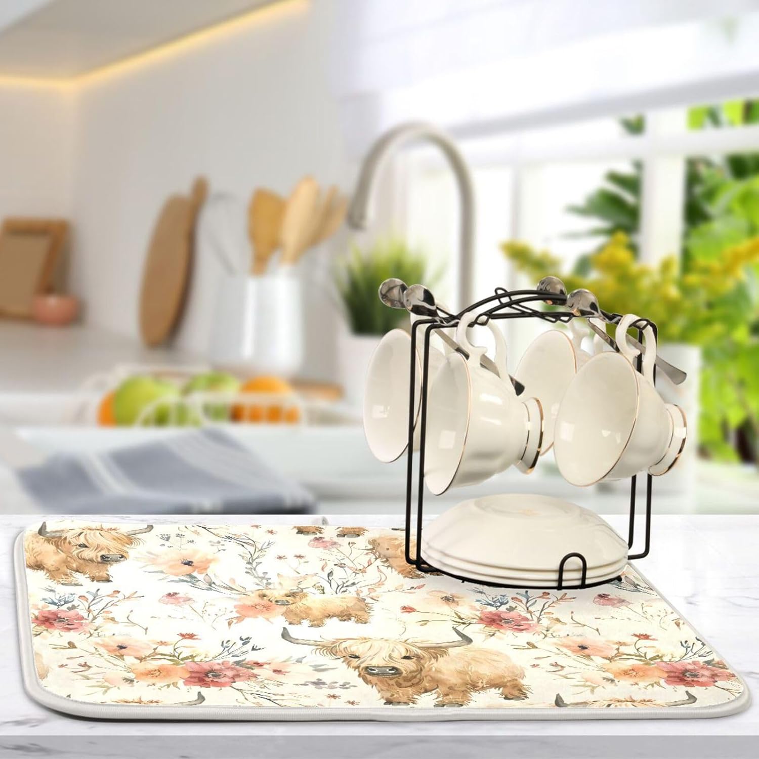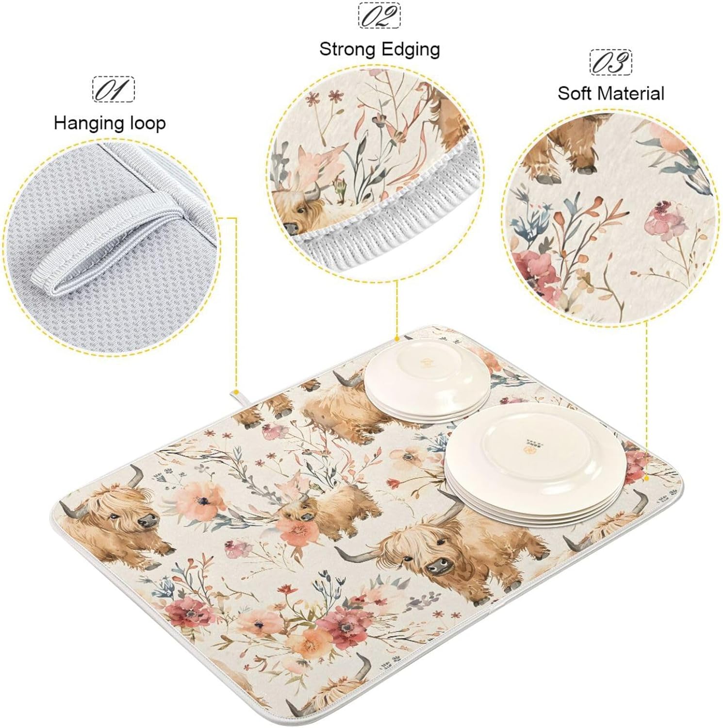 Cute Highland Cows Flowers Dish Drying Mat for Kitchen Counter Absorbent Microfiber Drying Pad, Medium 16x18 in, Reversible Drainer Mats