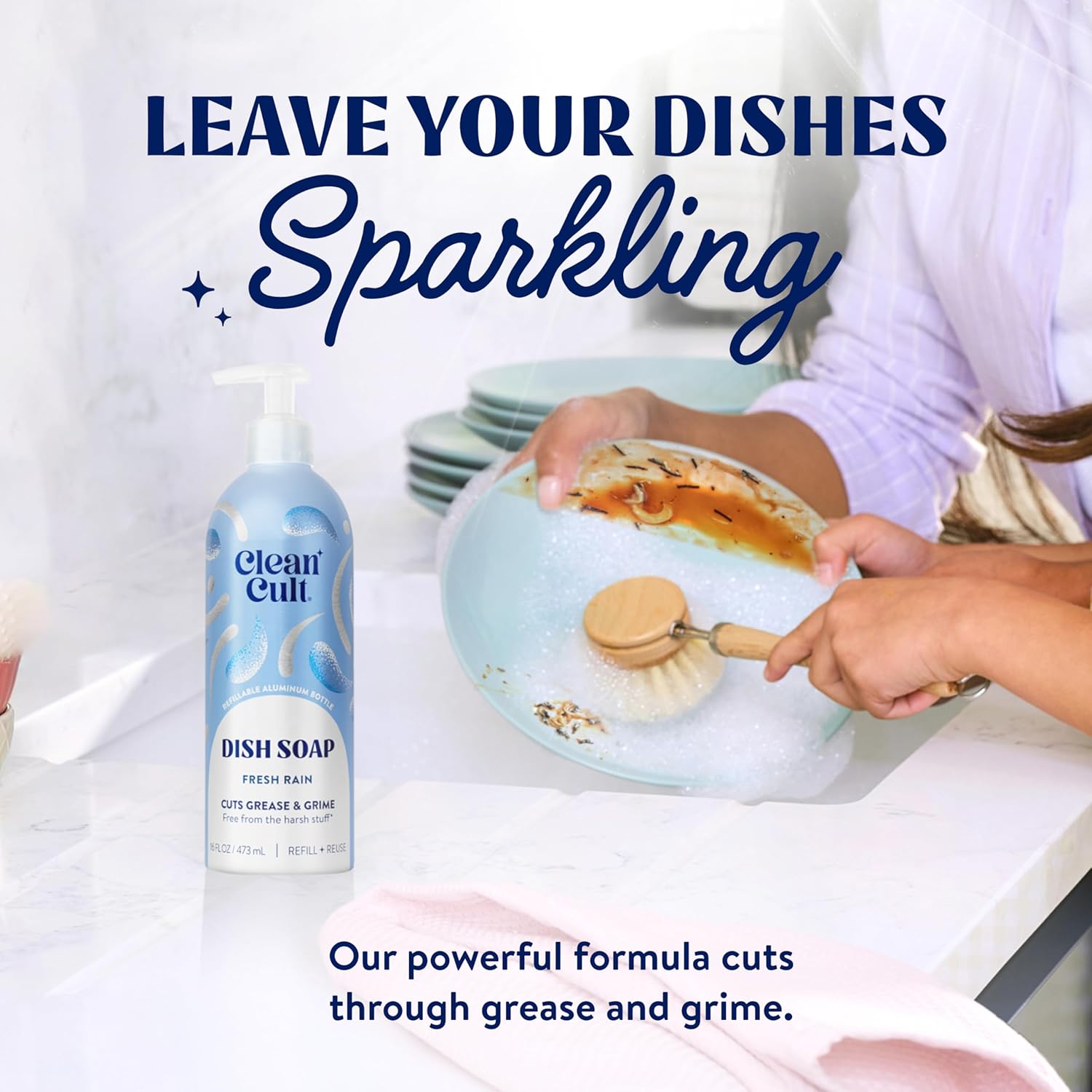 Cleancult Dish Soap Liquid Refill (32oz, 3 Pack) - Plant Based Cleaning Power - Dish Soap that Cuts Grease & Grime - Free of Harsh Chemicals - Uses 90% Less Plastic - Fresh Rain