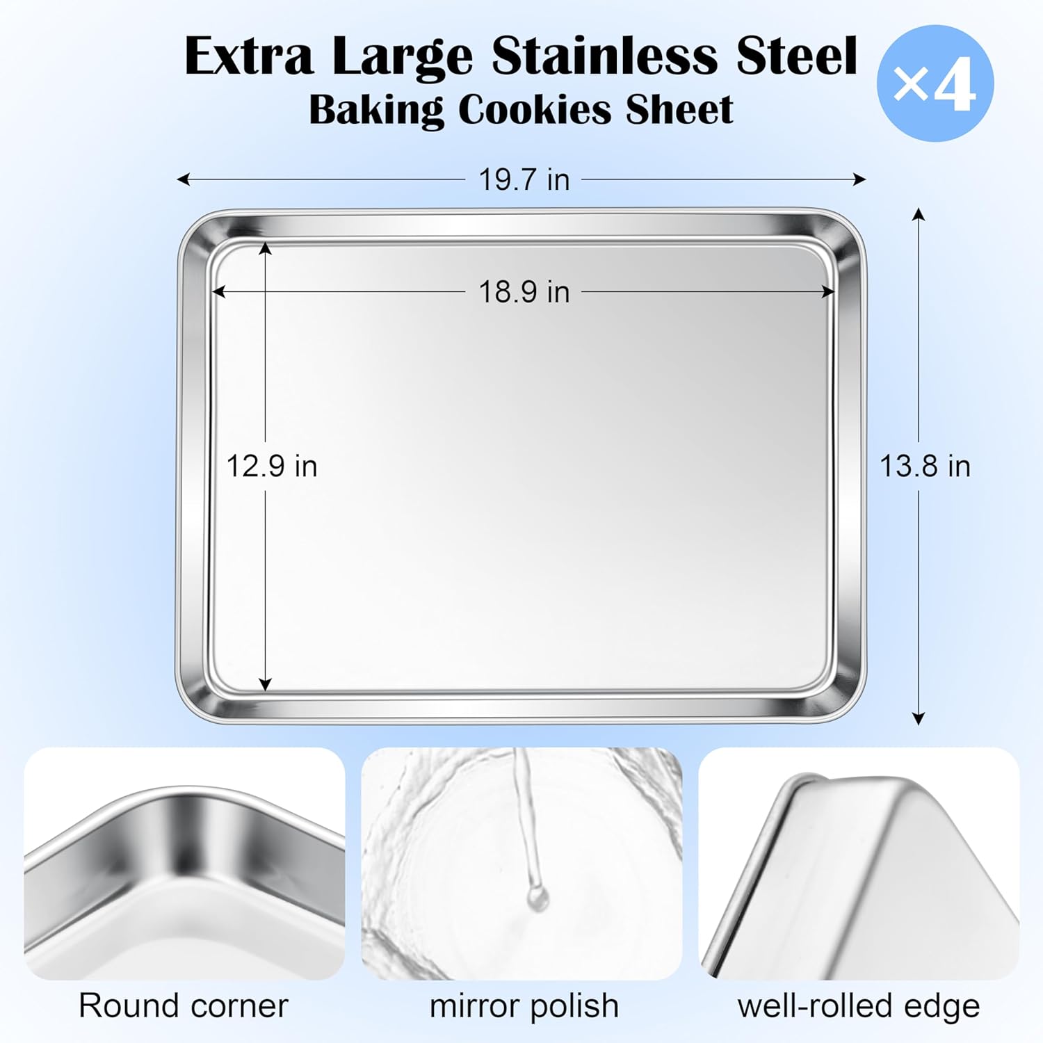 - 4 PACK LARGE COOKIE SHEETS: Dimension of 19.7”x 13.8”x 1.2” large enough for baking batches of cookies or as big tray to serve large portion dinner, Deep enough to keep juices from overflowing, 4-piece give you more flexible to roast bacon, vegetable or making jelly rolls/sheet cake at once, Ideal gift for wedding, housewarming or Christmas