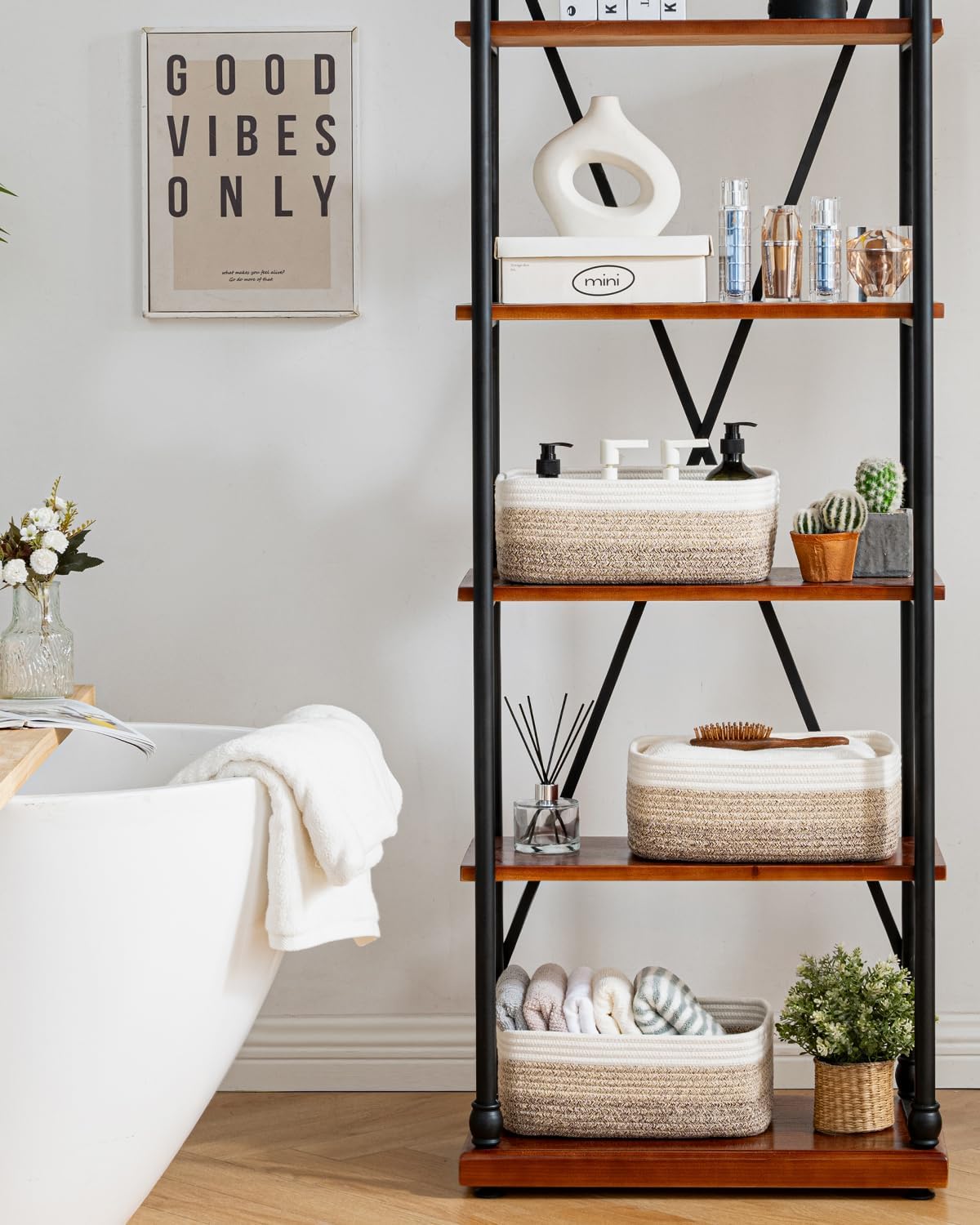 - [ Elegantly Designed to Match Any Décor ] Our small rope basket creates a minimalist appearance, and it adds a touch of warmth and texture to any room. The classic solid color design ensures seamless integration with your existing aesthetics, complementing any decoration. Perfect as decorative storage baskets for shelves, cabinets, and any open display space, making them a stylish and practical addition to any decor, enhancing the overall aesthetics of your room