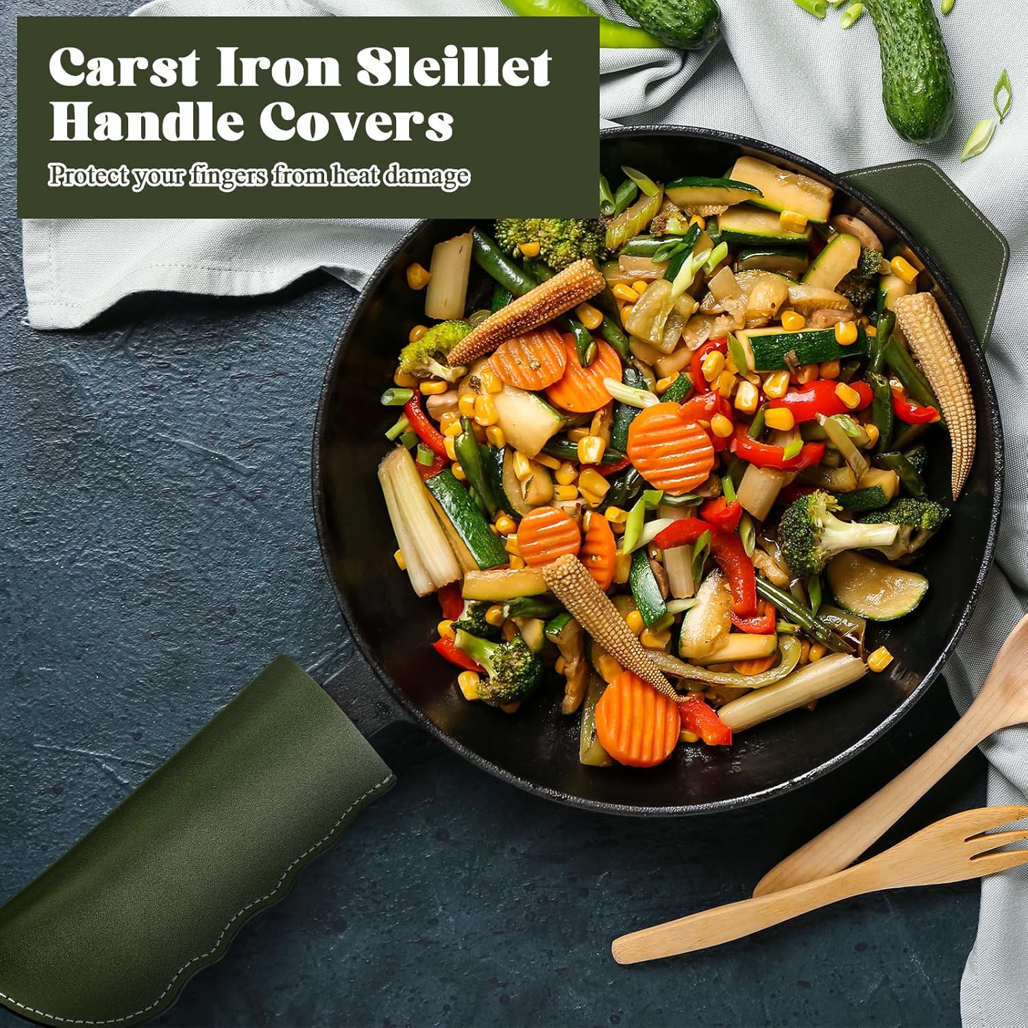 Baderke 4 Pcs Leather Cast Iron Handle Cover Handmade Leather Heat Resistant Skillet Handle Set Pot Holder for Hot Frying Pans, Pots(Army Green)