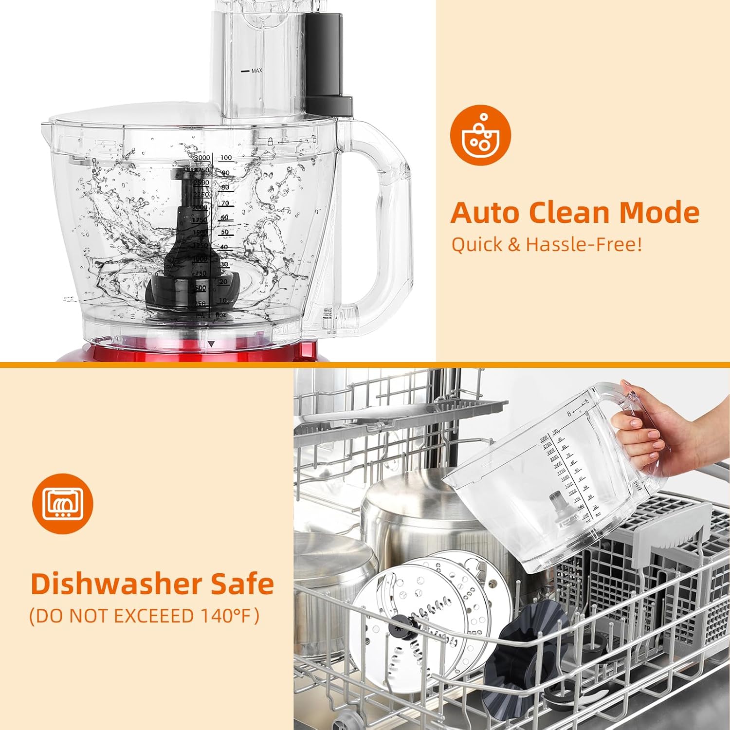 - 【Easy to Clean & Dishwasher-Safe Parts】 Hate cleanup? Use the Auto Clean mode—just add water and soap, then let our food processor red do the work! All detachable blades and bowls are also dishwasher-safe (except the motor base), making post-cooking cleanup quick and hassle-free. Perfect for busy home cooks who want a powerful, large capacity food processor that’s easy to maintain.(Note:Ensure the water temperature doesn't exceed 140°F and use an appropriate amount of detergent for cleaning.)