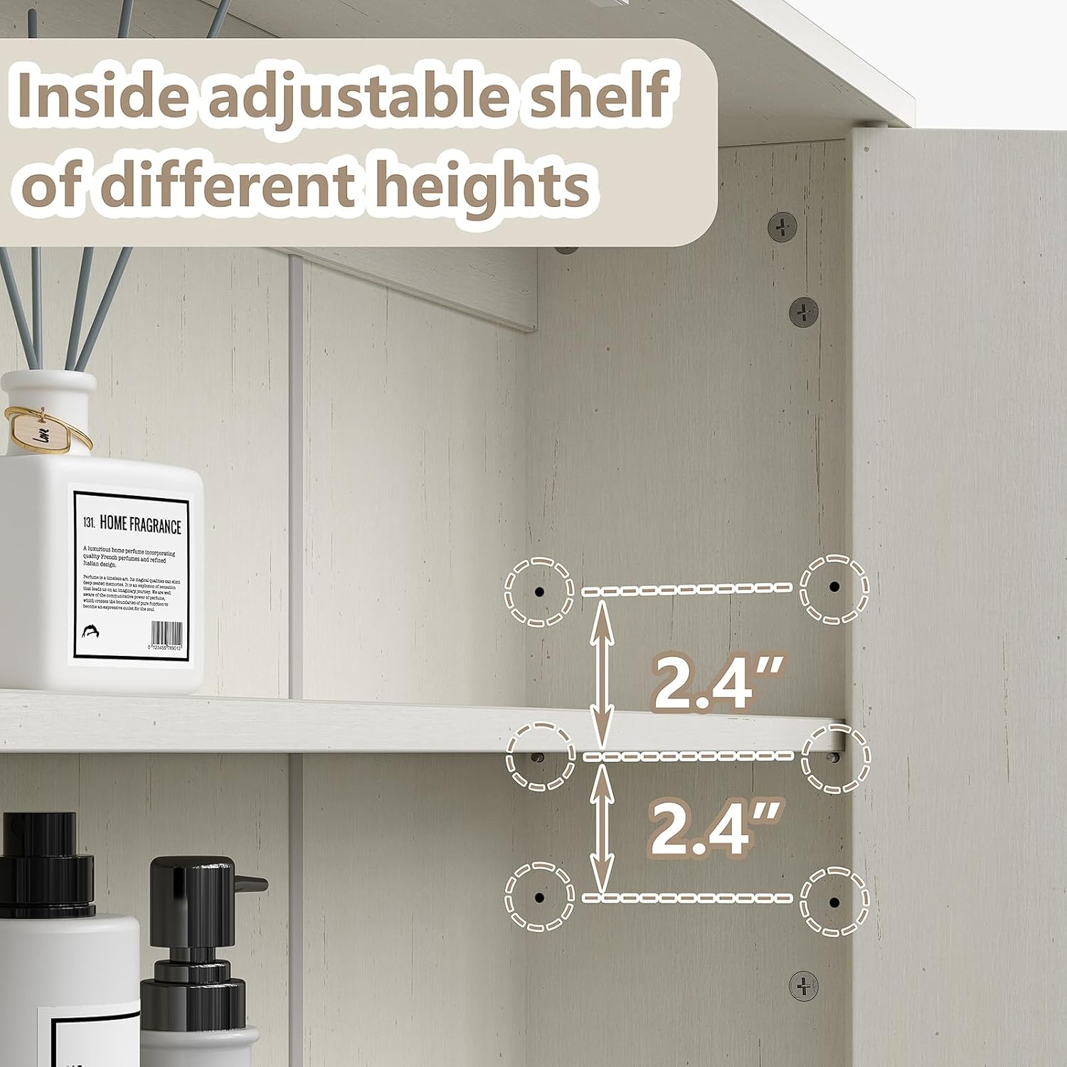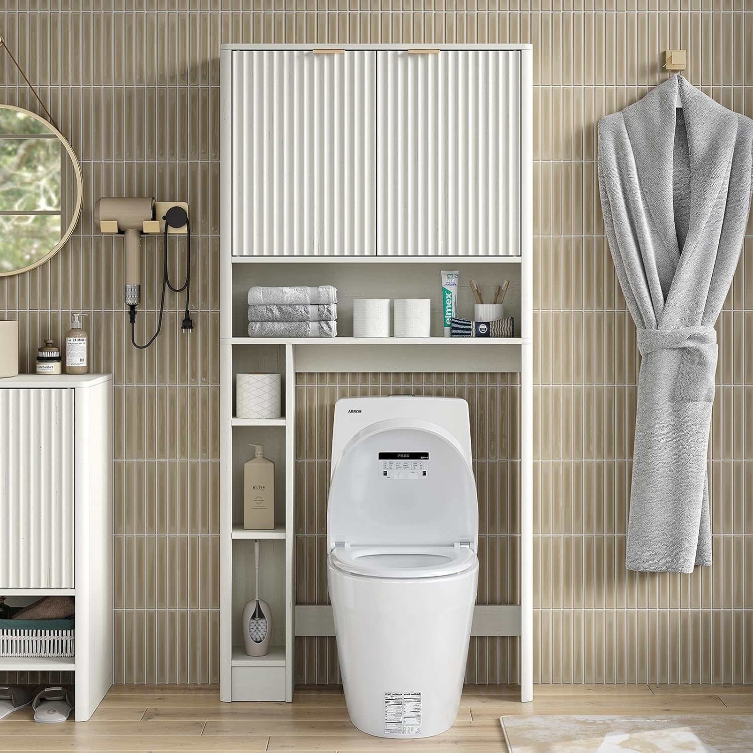 - 【Modern Fluted Style】With double fluted doors, adjustable shelf and opening compartment, ensuring your space stays organized. The bottom bar is height-adjustable to fit most toilets