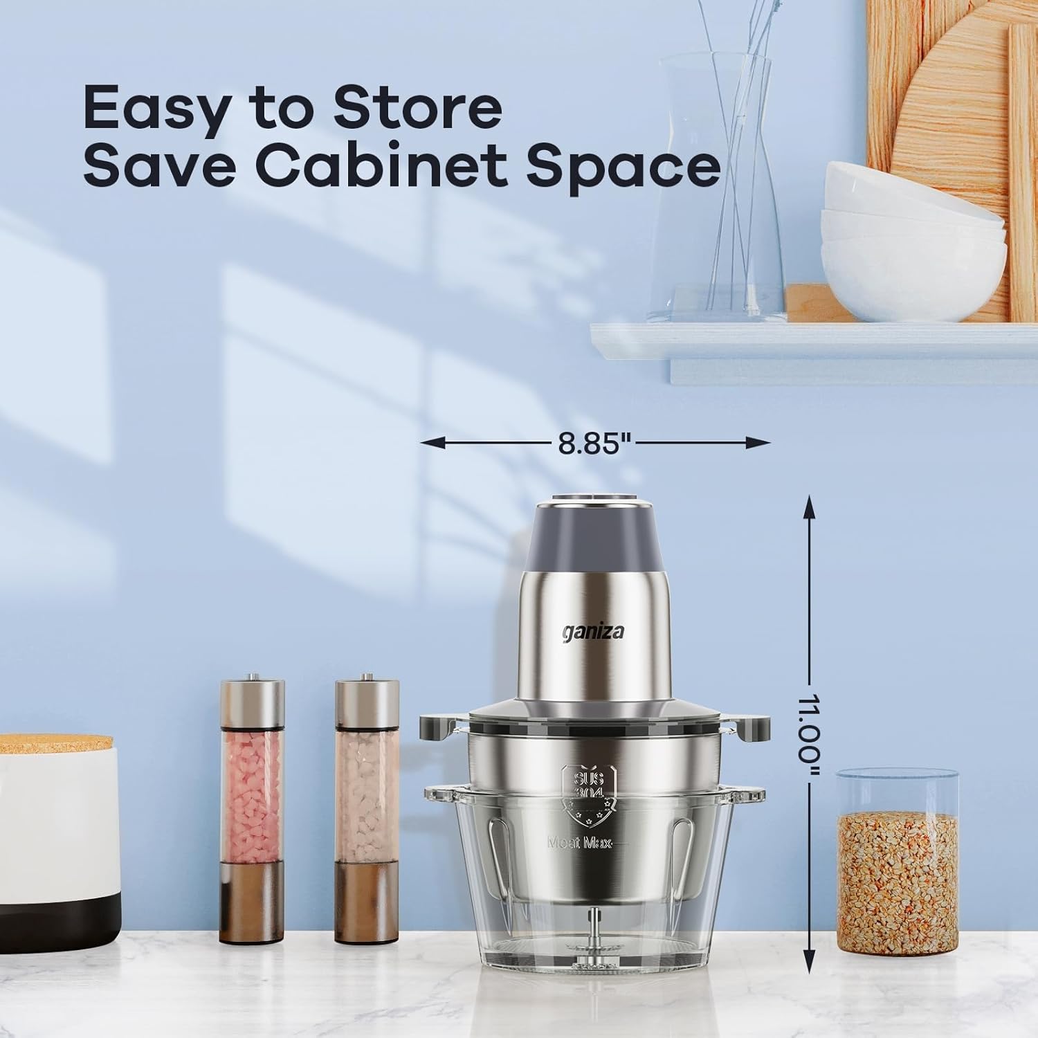 GANIZA Food Processors, Electric Chopper with Meat Grinder & Veggie Chopper - 2 Bowls with Powerful Copper Motor - Includes 2 Sets of Bi-Level Blades for Baby Food/Meat (Grey, 8 Cup+8 Cup)