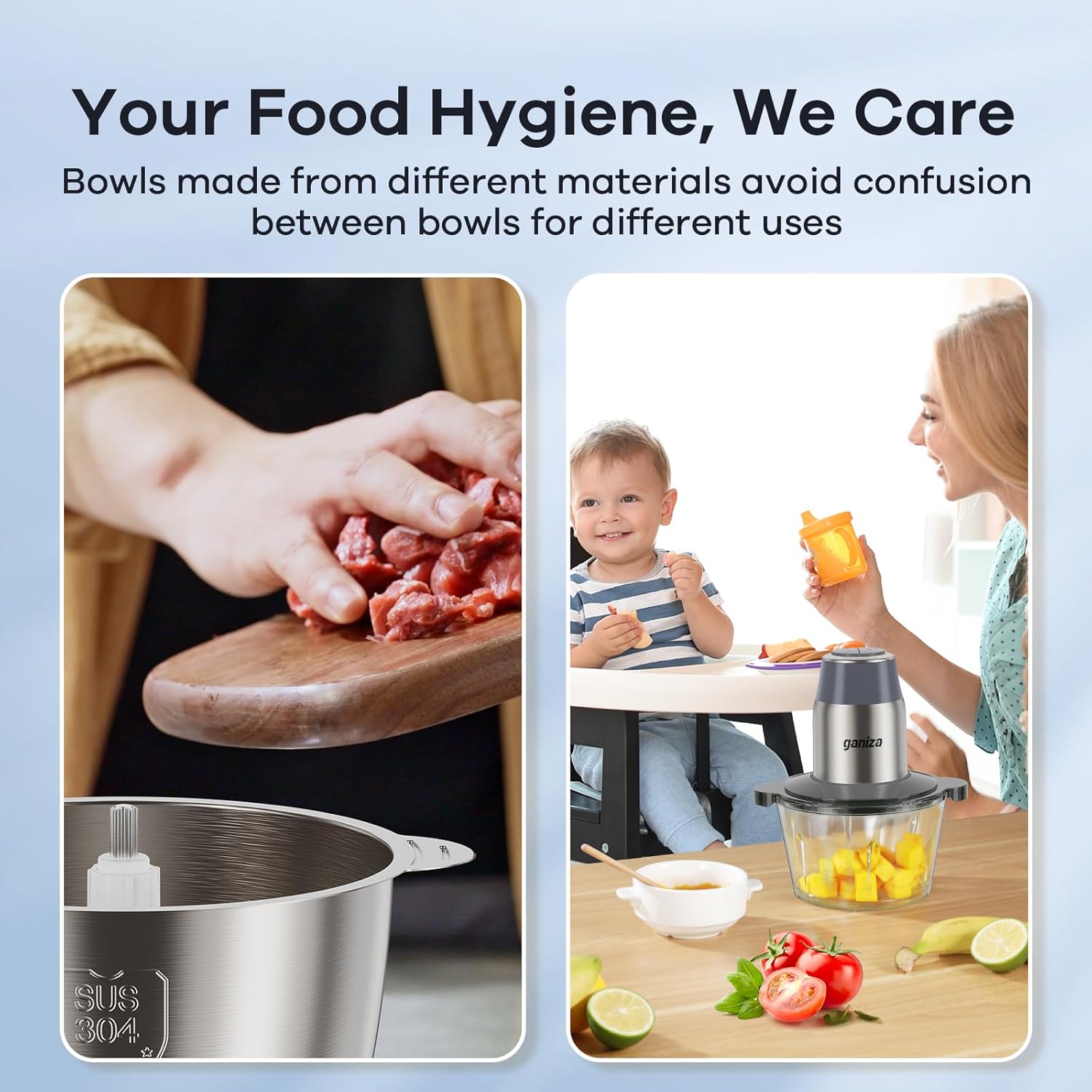 - 【Unlock Versatility with Two Bowls】Your food hygiene, we care. The Mixing Bowls are made from different materials (glass and sus 304 stainless steel) to avoid confusion between bowls for different uses, meat chopper and vegetable chopper, family processor and baby food processor.