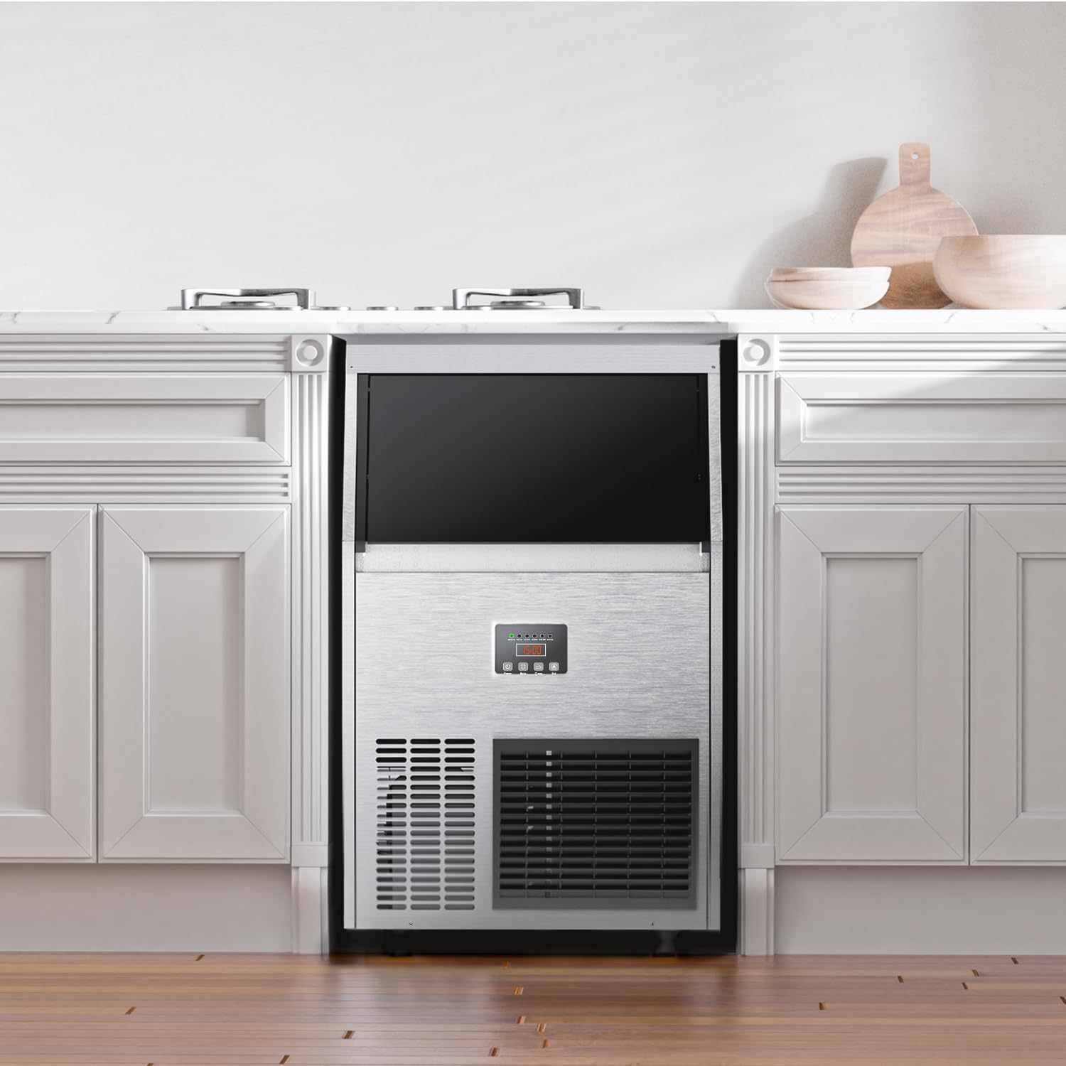 - Sleek Space Saver: Measuring 19.7 inches wide, 14.6 inches deep, and 32.9 inches high, the compact, self-contained unit can easily be built-in under counters or used freestanding, with a front-breathing air-cooled system to prevent overheating, popular in offices or boardrooms, and also a great small ice maker for bars. Instead of making last-minute dashes to the store for bags of ice, simply click a button