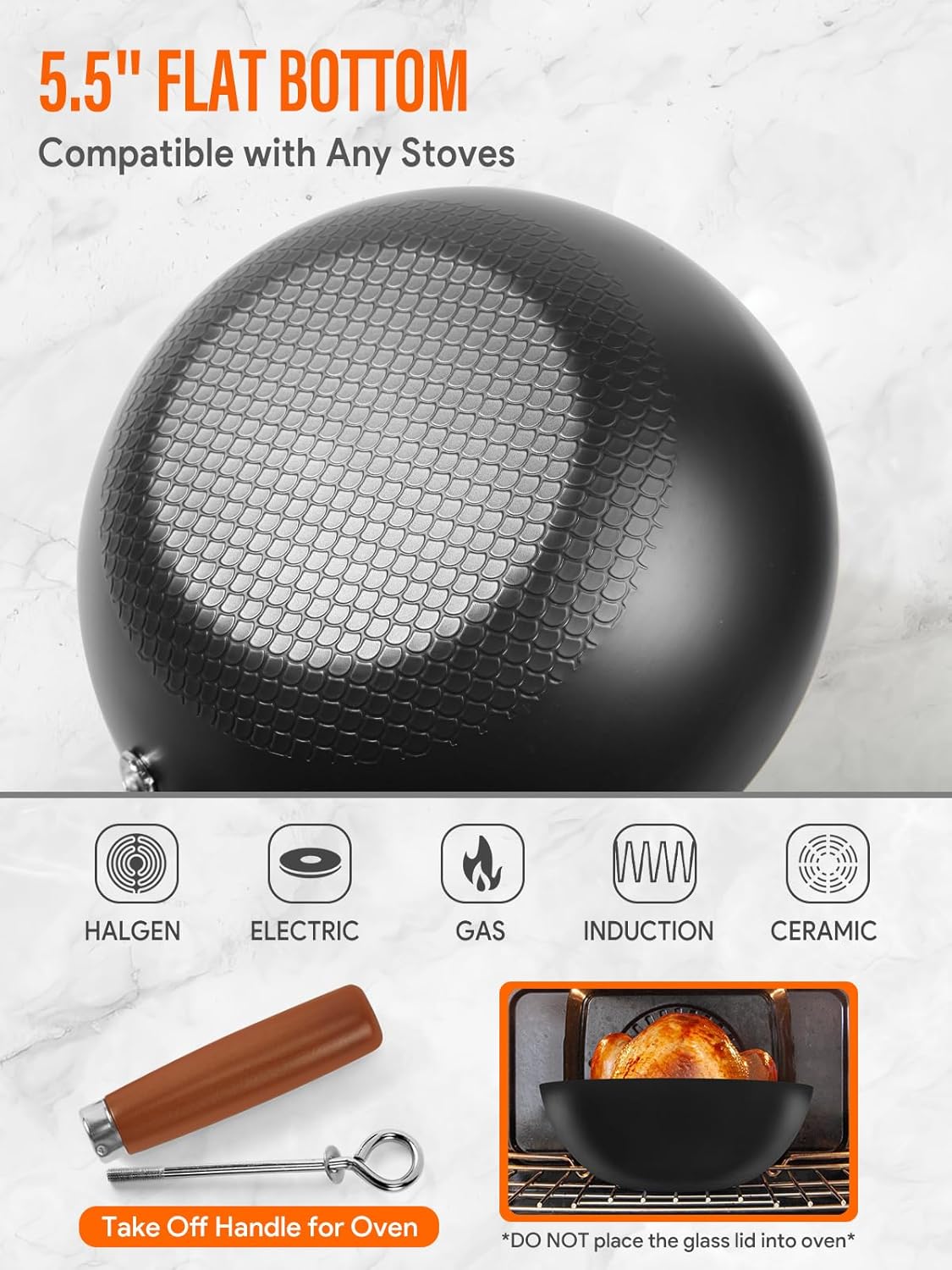 - 【QUALITY GLASS LID & WOODEN HANDLE】To complete the package, this wok set comes with a quality glass lid that allows you to monitor your cooking without losing heat or moisture. The wooden handle provides a comfortable and secure grip, ensuring that you can maneuver the wok with ease and confidence.