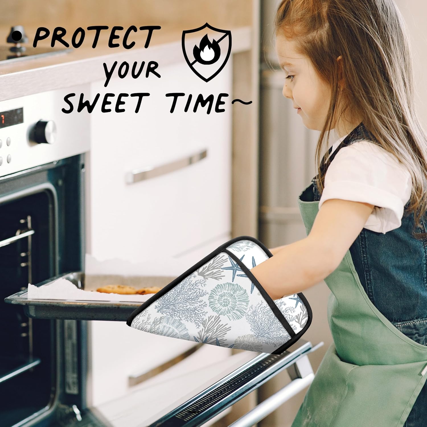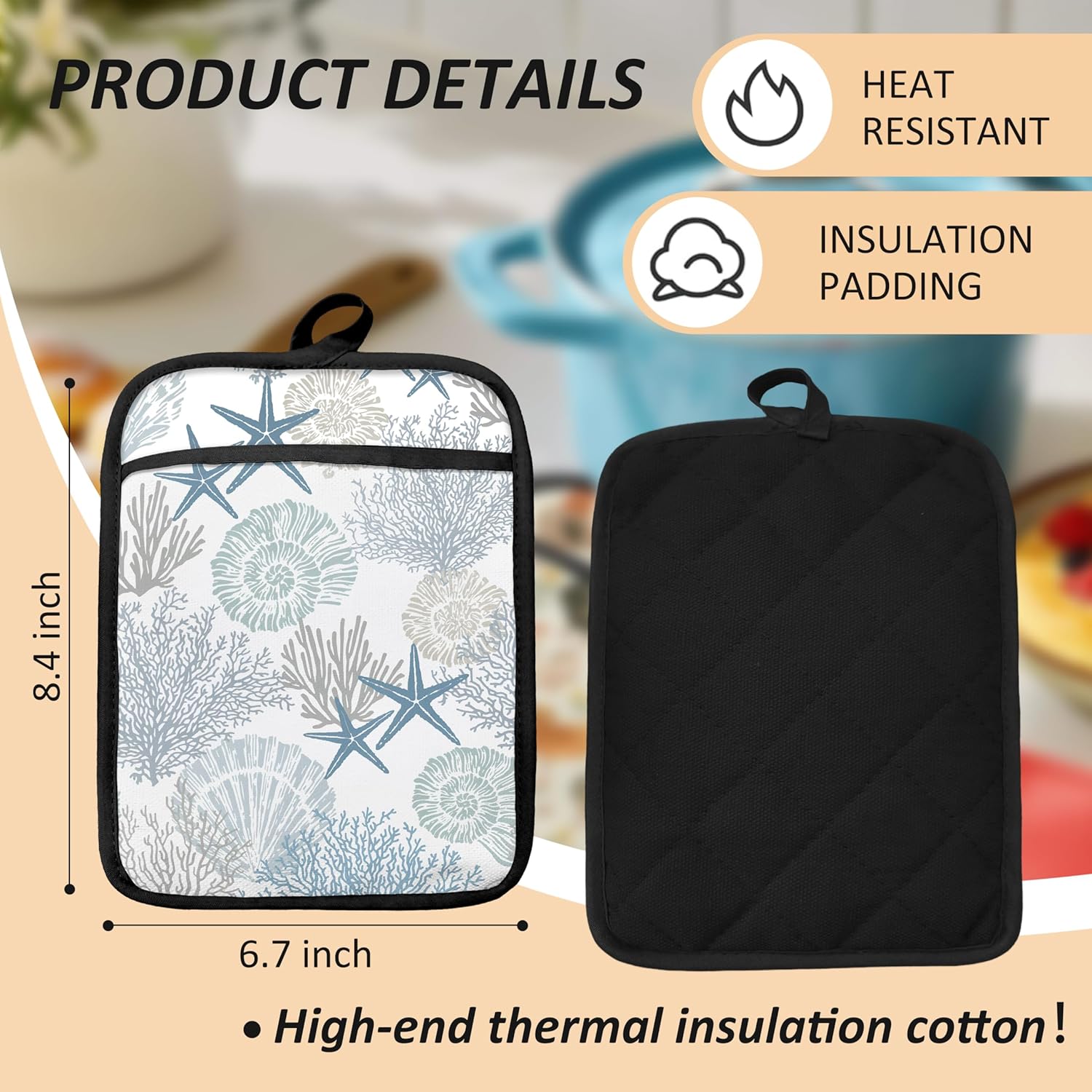Coastal Beach Seashell Coral Starfish Oven Mitts Set, Ocean Beach Gifts for Women, Blue Heat Resistant Kitchen Oven Gloves for Baking and Cooking,Pot Holders
