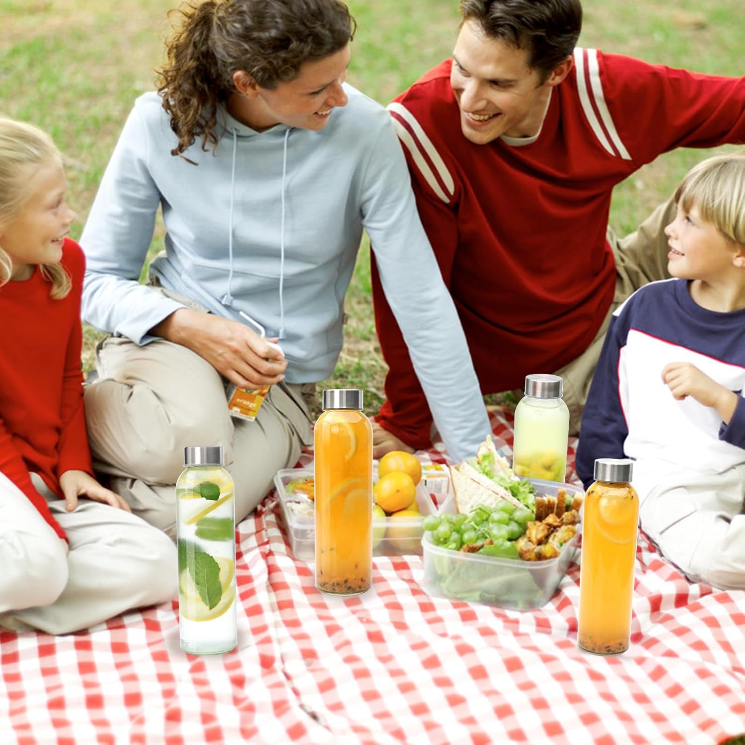 - WIDE USAGES:Glass bottles for juicing and more.Leak proof stainless caps,Each cap is lined with a rubber ring,won't leak to ruin your juices drinks without any worry of spills.Put this glass water bottle in your bag or car and get a healthy start to your day with a juice, smoothie, brew, ice tea, iced coffee, nut milk, milkshakes, kombucha or water.