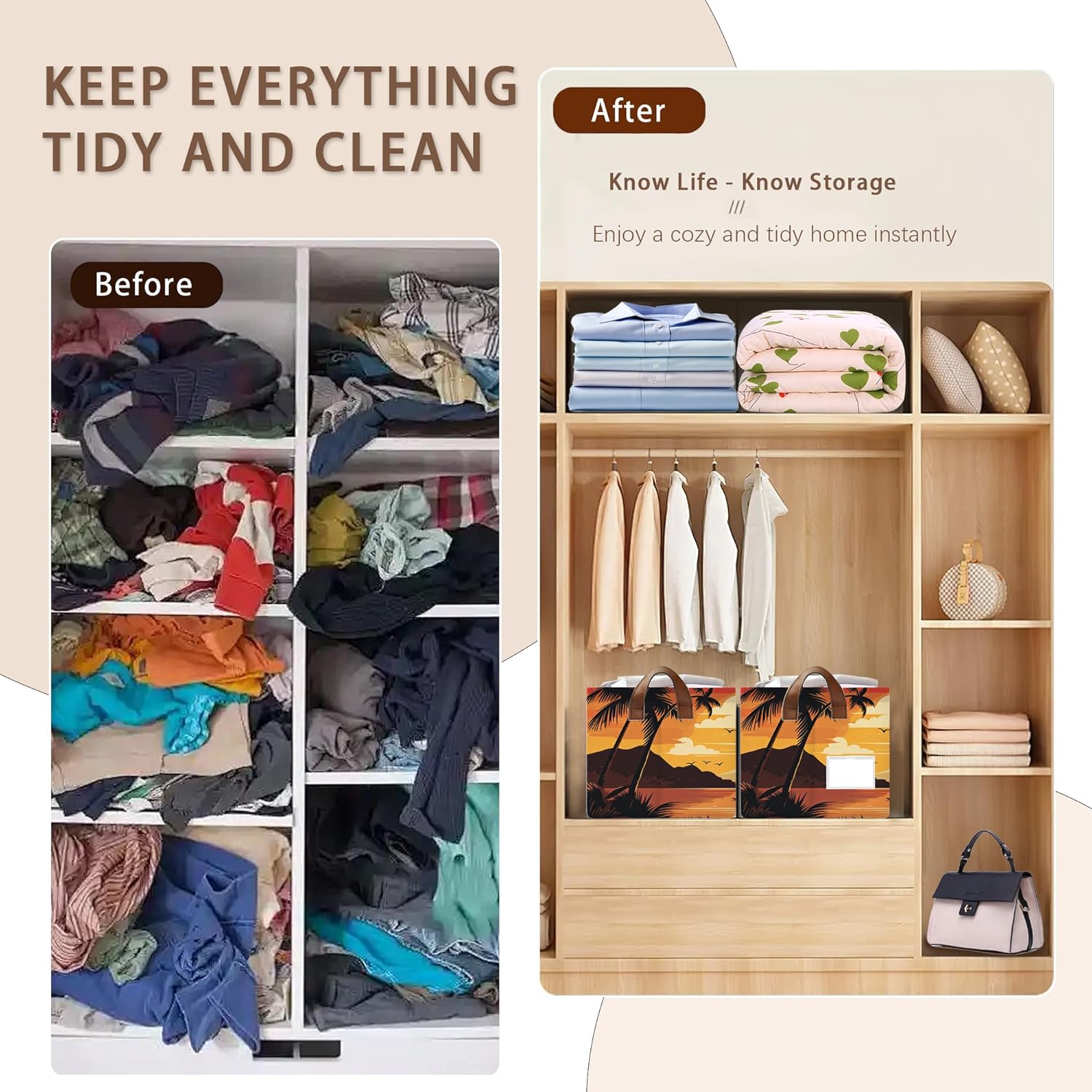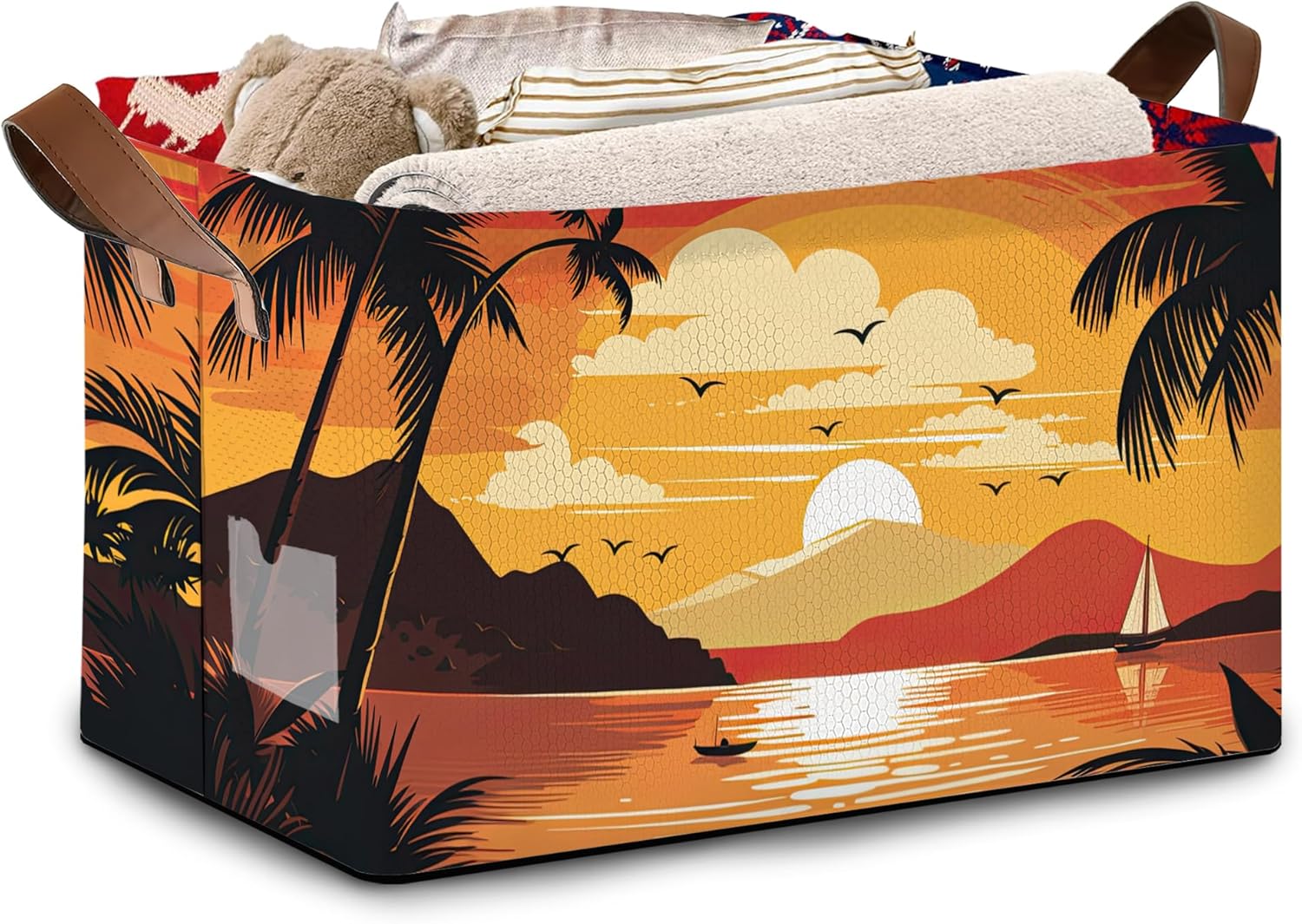 - Conveniently Within Reach: Mogifedc Summer Sunset,Beach Plam Tree Basket Comes With Leather Handles For Easy Transport. Each Handle Is Reinforced And Secured To The Basket With Extra-Strong Stitching,So The Basket Can Withstand Heavy Loads. Each Of These Soft Handles Ensures a Comfortable Grip,Making Housework a Breeze.