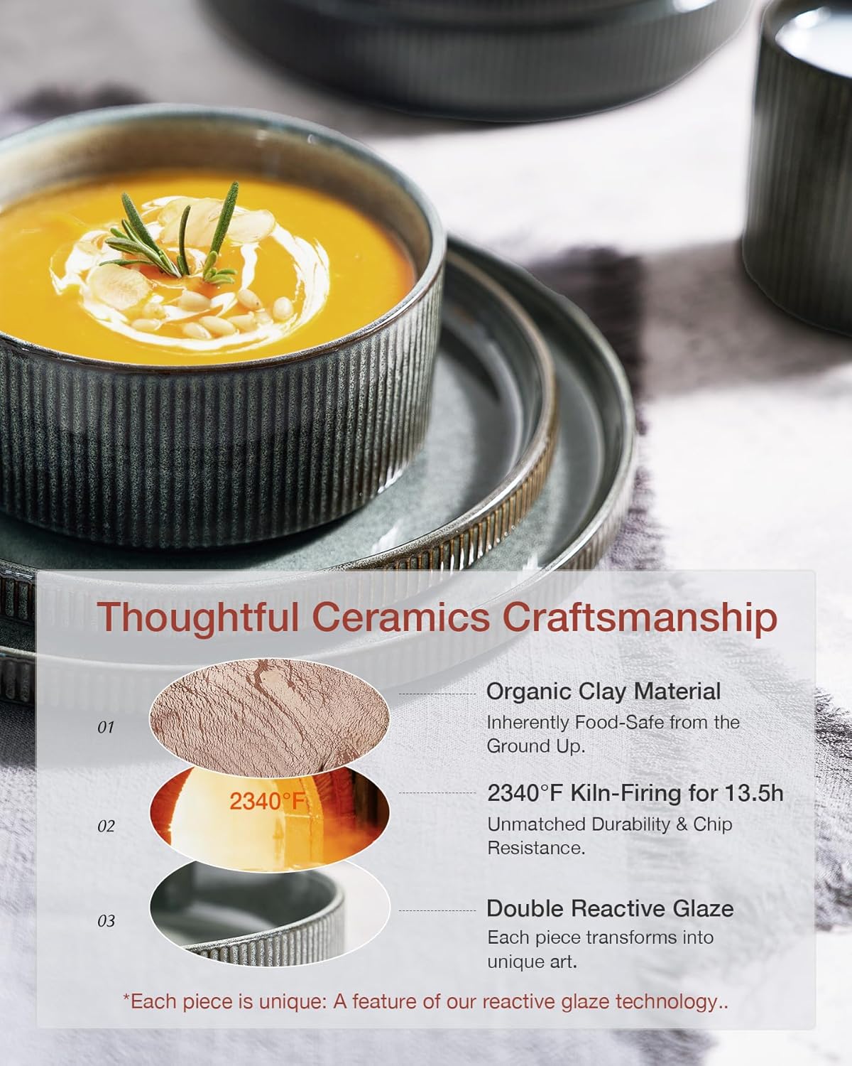 - [Premium Ceramic Durability]: Fired at 2340°F for 13.5 hours, our dishes boast impressive weight and thickness. They can resist chipping, scratching and daily wear, ensuring reliable kitchen use. Enjoy worry-free daily use, even with silverware