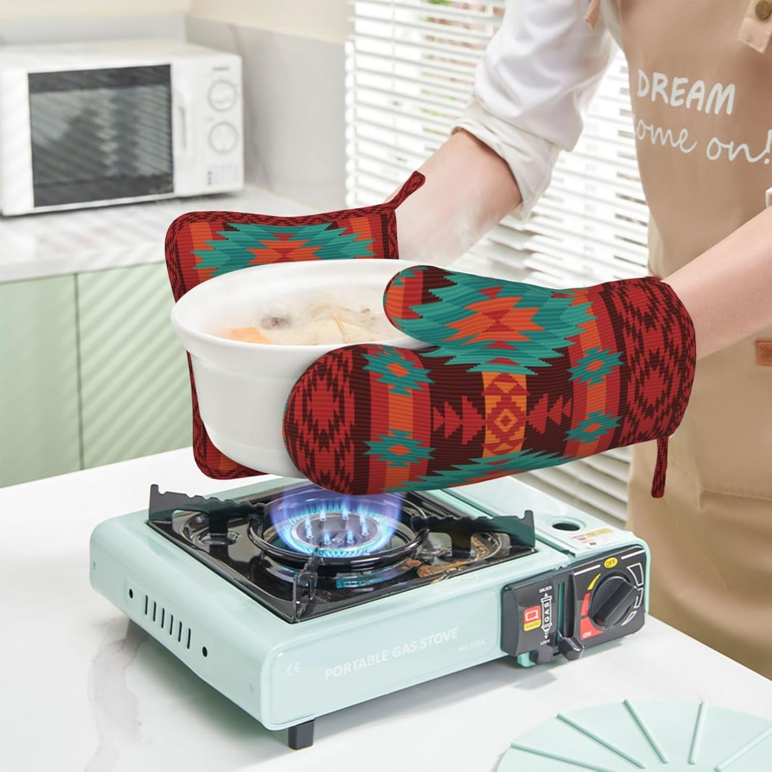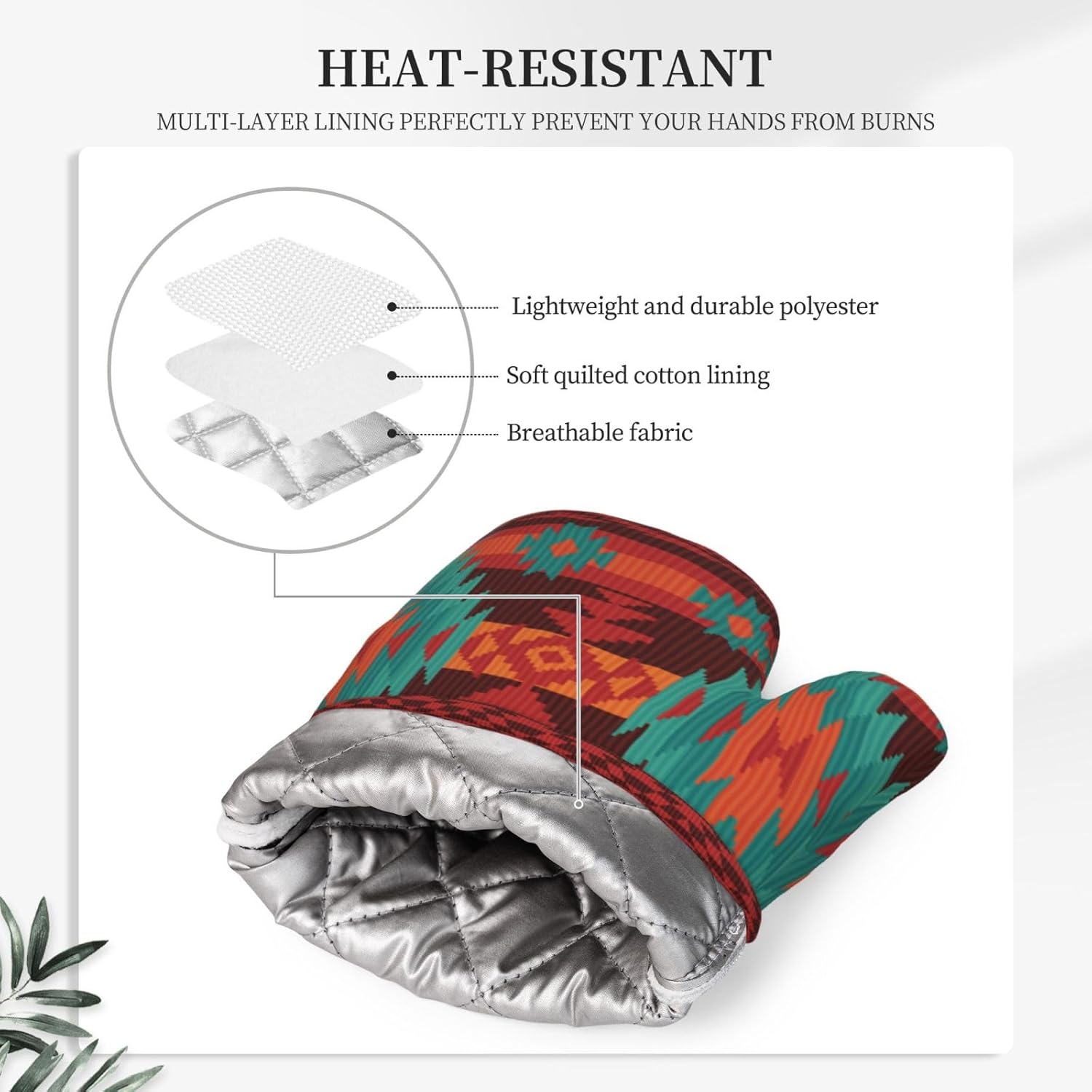 - NON-SLIP GRIP: The geometric ethnic tribal oven mitts feature a textured, non-slip surface that enhances your grip and control when handling hot items. This provides you with a secure hold, reducing the risk of accidental slips or drops while transferring dishes from the oven or stovetop