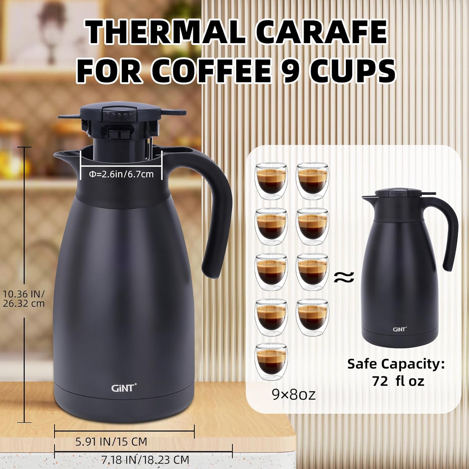 GiNT 2.2L / 74Oz Thermal Coffee Carafe, Insulated Stainless Steel Coffee Carafes for Keeping Hot/Double Walled Vacuum Thermal Carafe (Black)